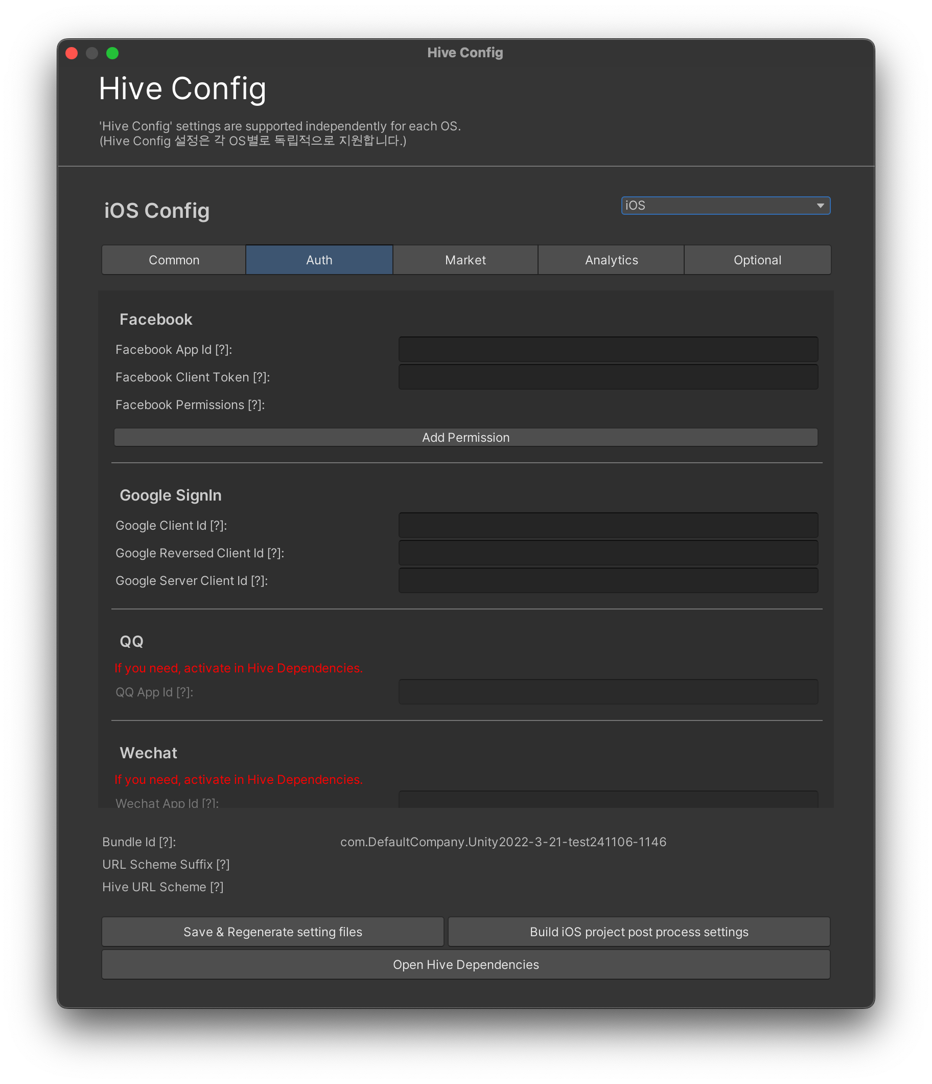 Hive SDK Unity는 Unity Inspector를 사용해 hive_config.xml을 설정할 수 있습니다. Hive > Hive Config (Edit Config)를 선택하고 Unity Hive Config Editor 화면에서 OS와 Hive AppID를 설정합니다. 그 후에, Auth 메뉴에서 Facebook, Google SignIn, Google Play Games, QQ 등 사용하려는 IdP에 따라 각 IdP 제공자 콘솔에서 발급받은 AppID, 웹 애플리케이션 ClientID 등을 입력하세요.