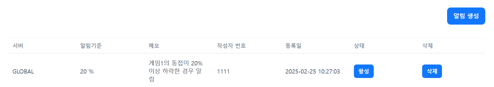 - 예) 알림 기준을 20%로 설정한 상태에서 이전 동접 10,000 이고 현재 동접이 8,000 이하인 경우 알림 발생