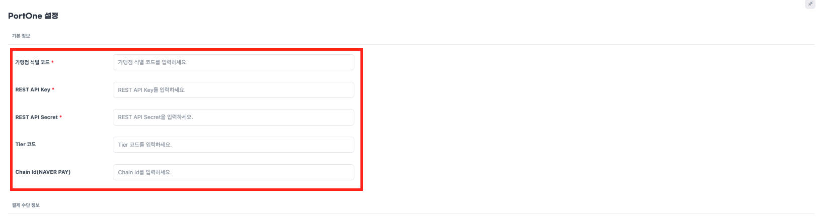- PortOne 관리자 콘솔의 시스템 설정에 등록된 정보를 동일하게 입력합니다.