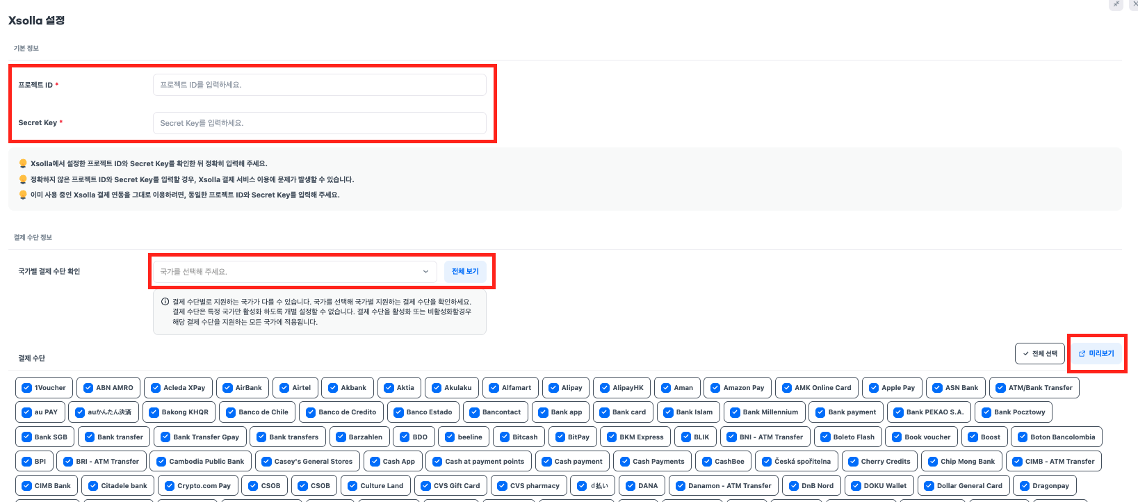- 국가를 선택한 경우 그 국가에서 지원하는 결제 수단 중 활성화된 항목한 미리보기에서 확인할 수 있습니다.