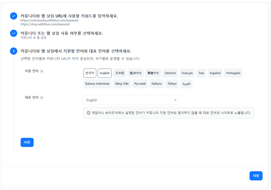 6. 커뮤니티와 웹 상점에서 지원 언어와 대표 언어를 선택하세요.