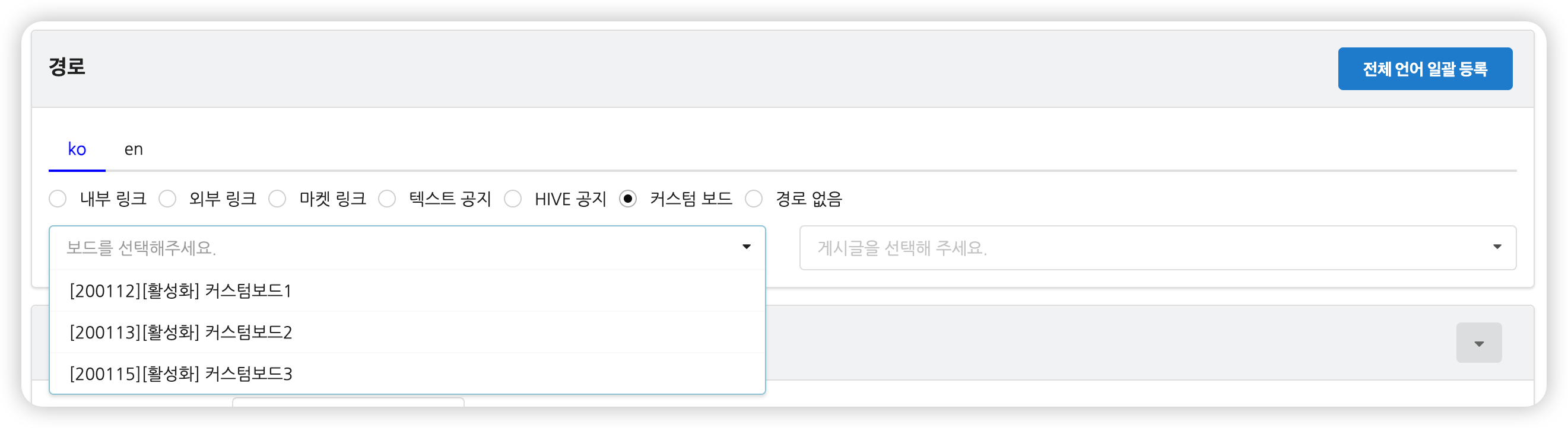 해당 게임 커스텀보드에 등록한 게시글이 항목으로 노출되며, 경로로 선택할 수 있습니다. 첫번째 드롭다운에서 보드를 선택하면, 두번째 드롭다운에서 해당 보드의 게시글을 선택합니다. 특정 게시글이 아닌 게시글 리스트로 연결하려면 '커스텀 보드 게시글 리스트로 연결'을 선택해 주세요.