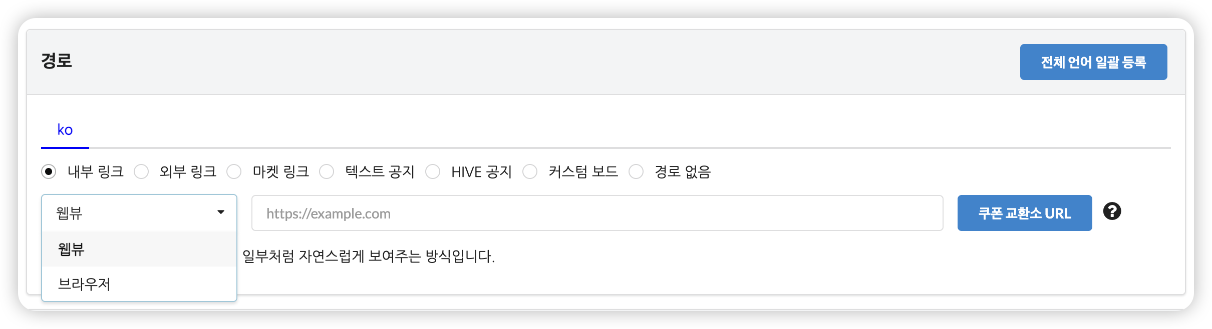 언어별로 URL을 입력할 수 있으며 입력하지 않은 언어의 경우 기본 언어의 URL로 이동됩니다.