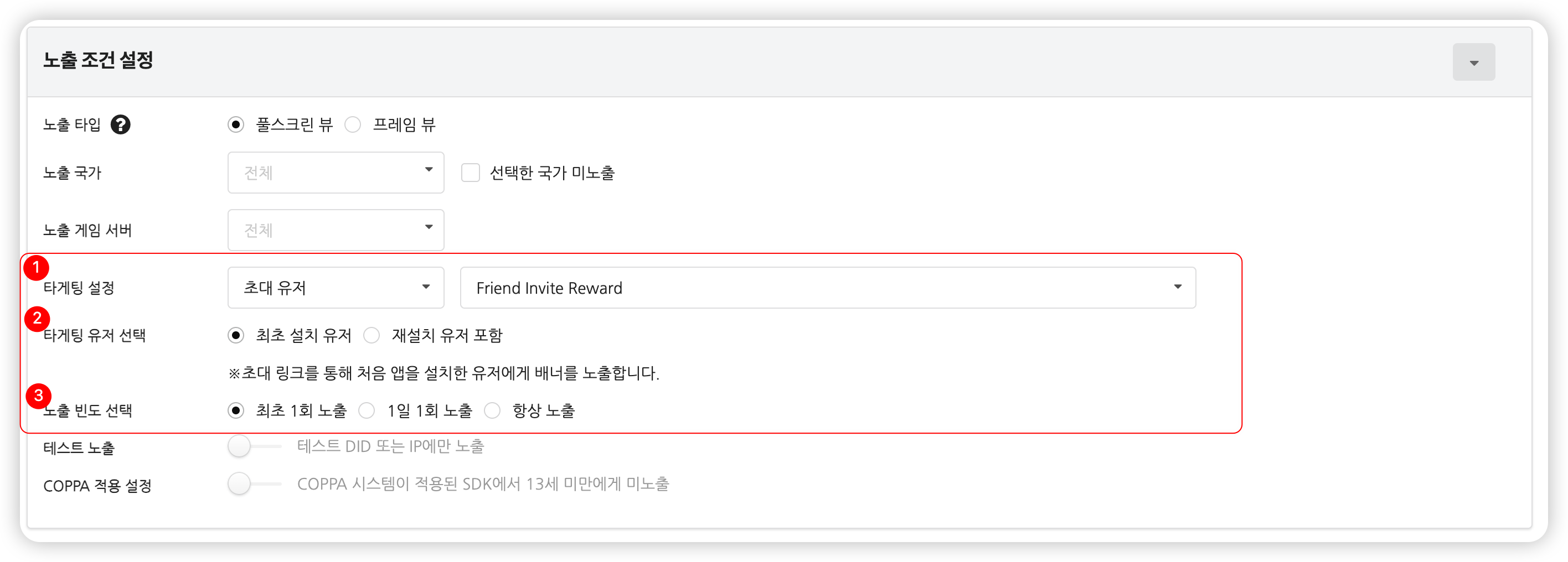 • 초대 유저 : 친구 초대를 받은 유저를 대상으로 타겟팅 캠페인을 진행합니다. 초대를 받은 유저 중 앱을 처음 설치한 유저에게만 배너를 노출하도록 설정할 수 있으며, 배너 노출 빈도를 선택할 수 있습니다.