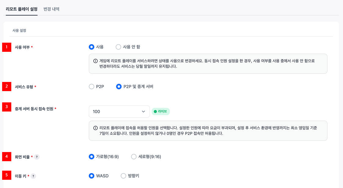 - 리모트 플레이의 서비스 여부를 설정합니다. 사용을 선택할 경우 리모트 플레이 사이트가 자동으로 생성됩니다.
