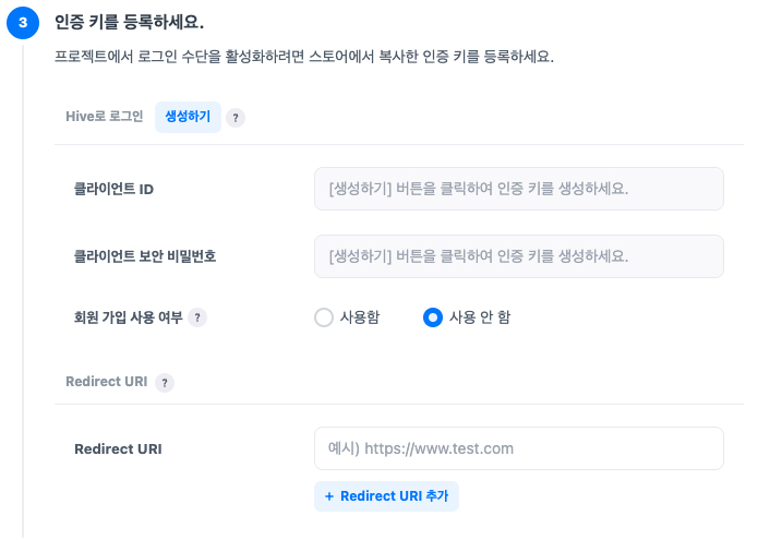 인증 키 등록 시 필요한 설정 항목은 아래와 같습니다.- 회원가입 여부 등록: 웹 로그인 IdP로 Hive 웹로그인 을 선택 시 회원 가입 사용 여부 를 설정할 수 있습니다.