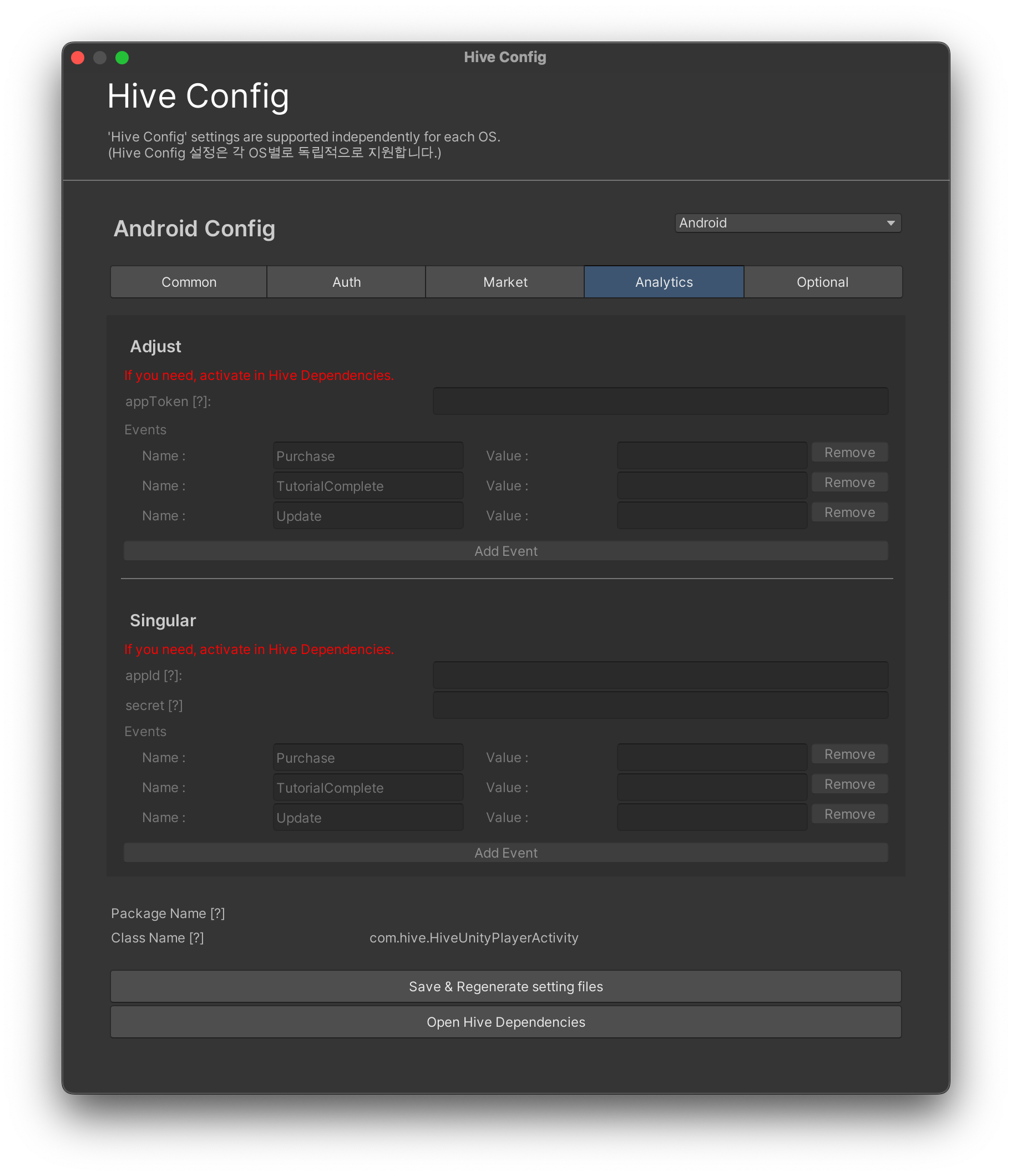 - Android: Save & Regenerate setting files 버튼을 클릭해 AndroidManifest.xml 파일과 hive_config.xml 파일을 생성하세요. hive_config.xml 파일은 다음의 디렉토리에 생성됩니다.