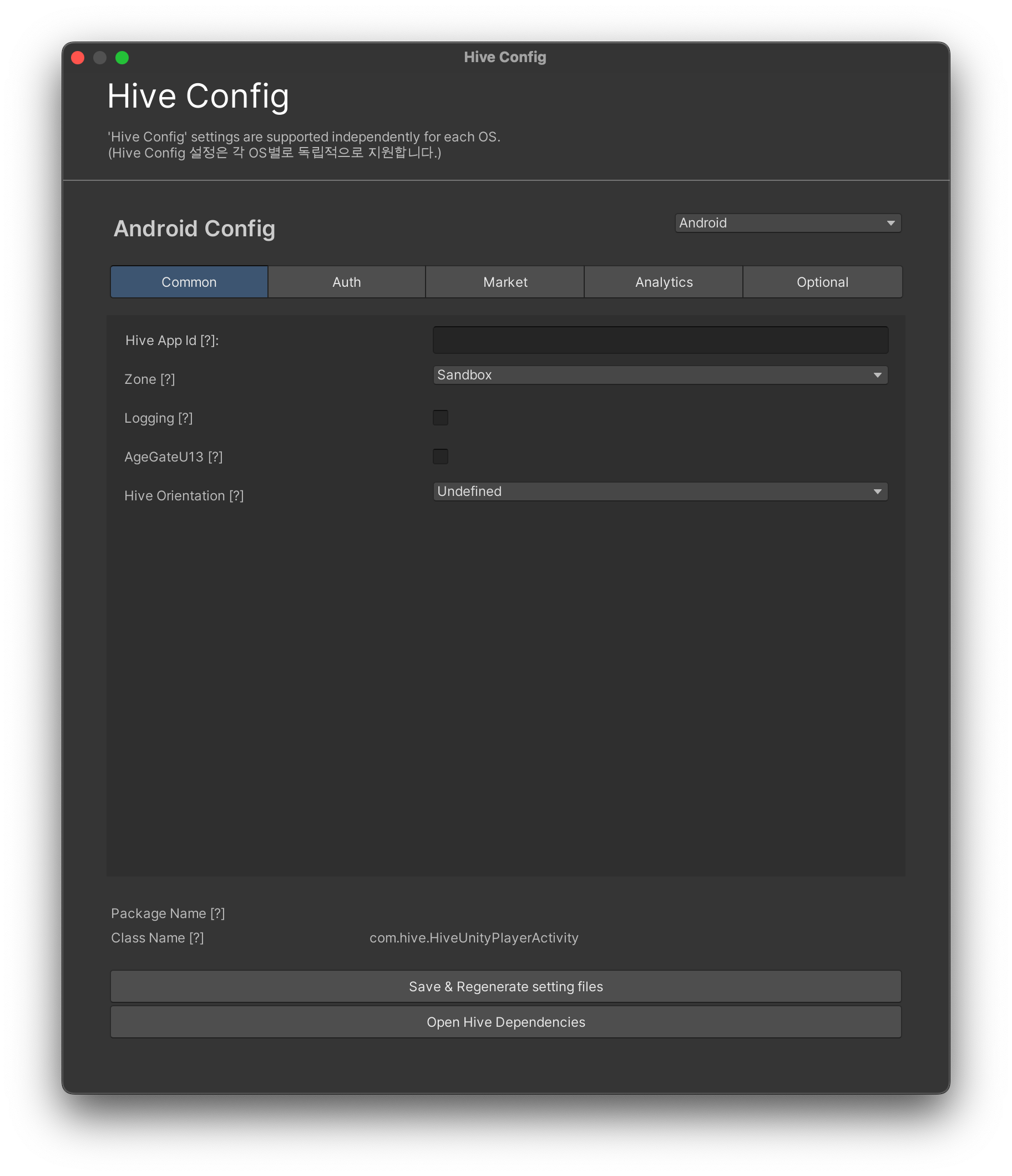 Unity 환경에서는 Unity Config Editor로 hive_config.xml 파일을 자동으로 생성하고 설정값을 할당할 수 있습니다.