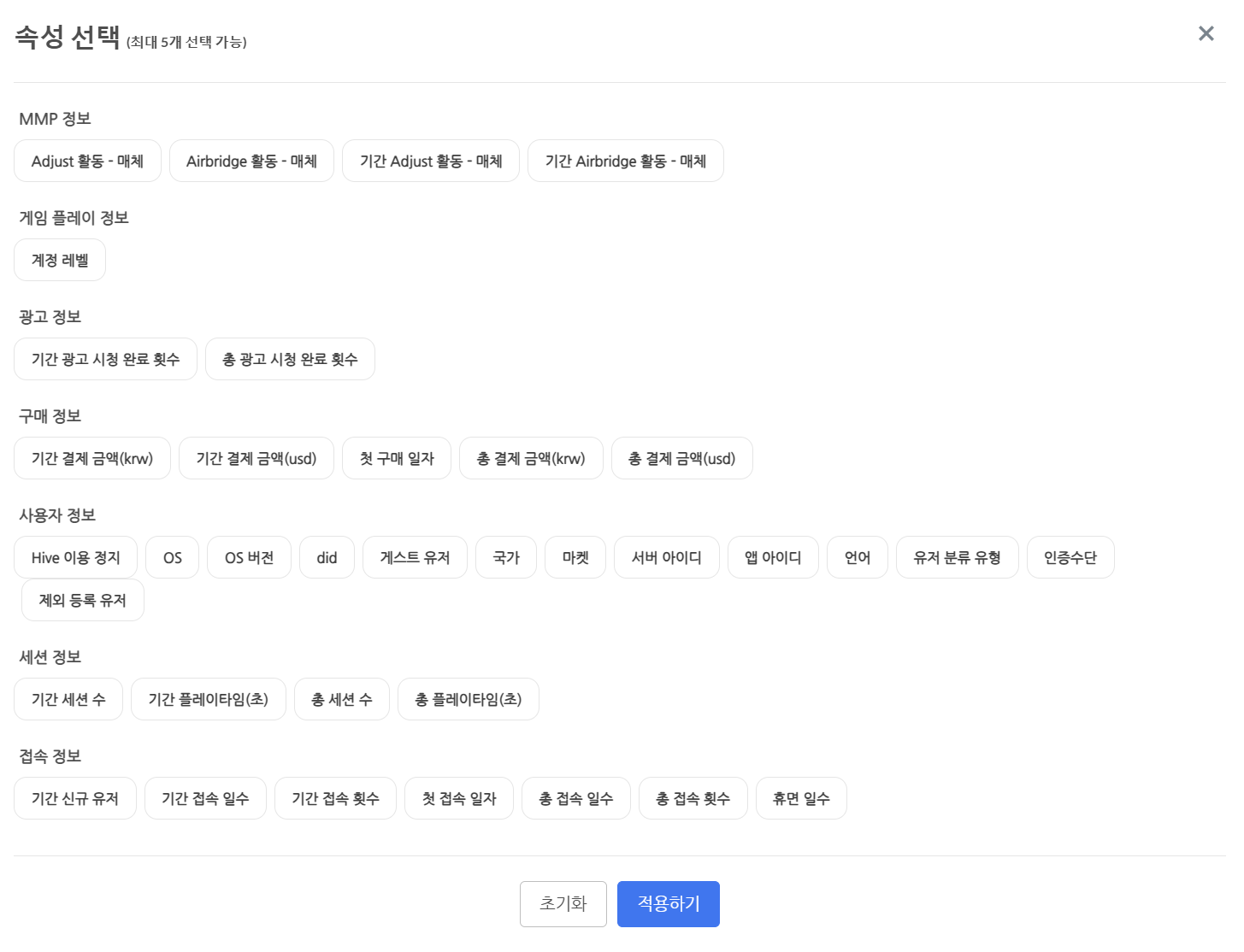 - 게임 SDK 연동을 통해 기본적으로 확인할 수 있는 속성 목록은 아래와 같습니다. 단, SDK 버전 차이 등의 이유로 인해 각 속성에 대해 수집되는 로그가 없는 경우 일부 속성이 선택 화면에 노출되지 않을 수 있습니다.