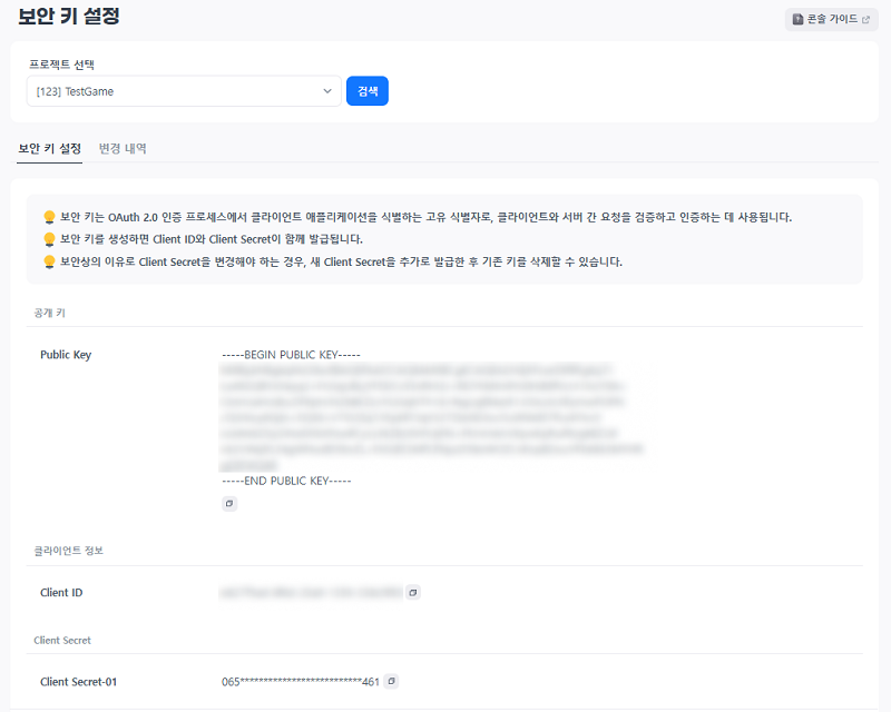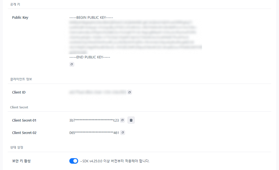 - Public Key와 Client ID는 한 개만 생성할 수 있으며, 한 번 생성하면 변경할 수 없습니다.