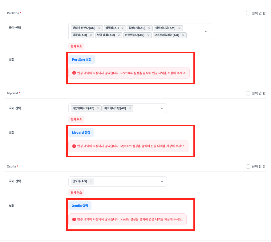 - 예시: PortOne 서비스 국가를 ‘대한민국(KR)’ 선택 -> Mycard, Xsolla에서 ‘대한민국(KR)’ 선택 불가