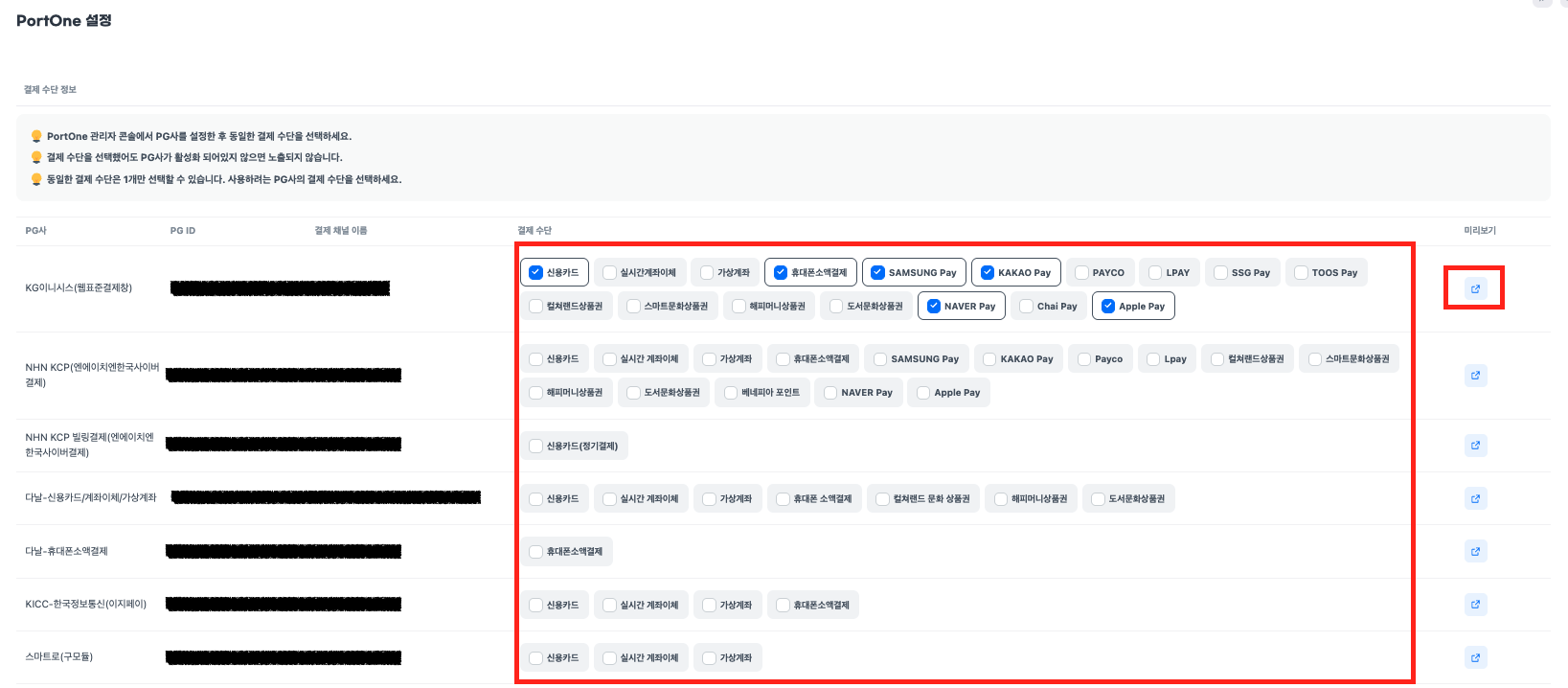 - 사용할 결제 수단을 선택할 때 KCP 의 경우 PG ID를 확인해 PortOne 관리자 콘솔과 동일하게 활성화 해야합니다.