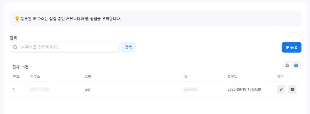 • 등록된 IP는 IP 목록에서 확인할 수 있습니다.