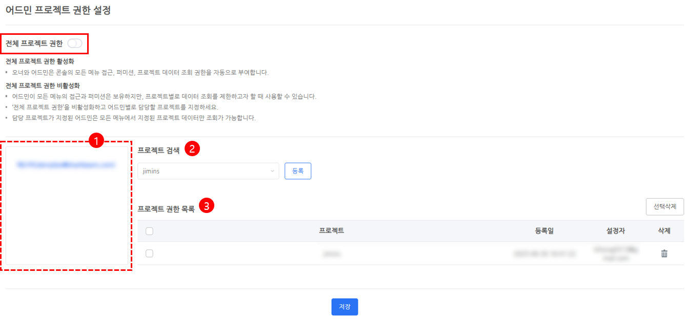 [3] 프로젝트 권한 목록 : 선택한 어드민에게 부여된 프로젝트 확인 및 삭제할 수 있습니다.