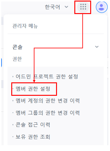 권한 관리자(오너, 어드민)는 ‘콘솔 > 권한 > 멤버 권한 설정’ 메뉴에서 멤버의 권한을 관리할 수 있습니다.