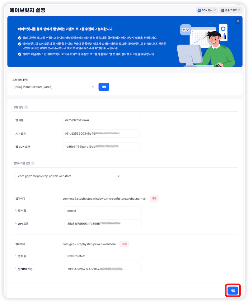 - API 토큰 : PC 앱에서 발생한 이벤트 로그를 수집하기 위한 토큰 정보입니다. 또한 Hive 애널리틱스에서 모바일/PC 이벤트 데이터를 수집하고 지표를 제공하는데 활용됩니다.