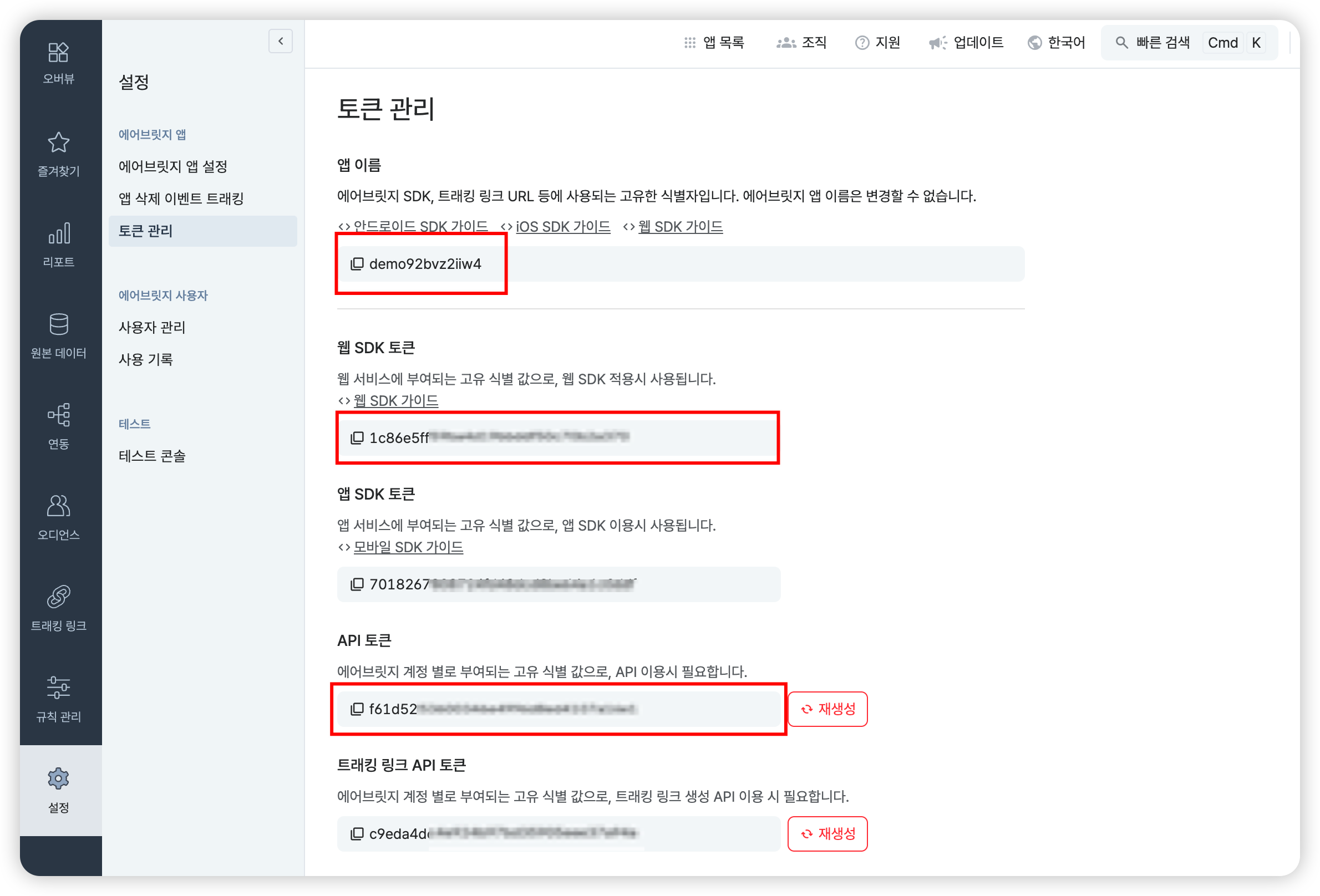 앱 이름, 웹 SDK 토큰, API 토큰을 복사해 주세요.