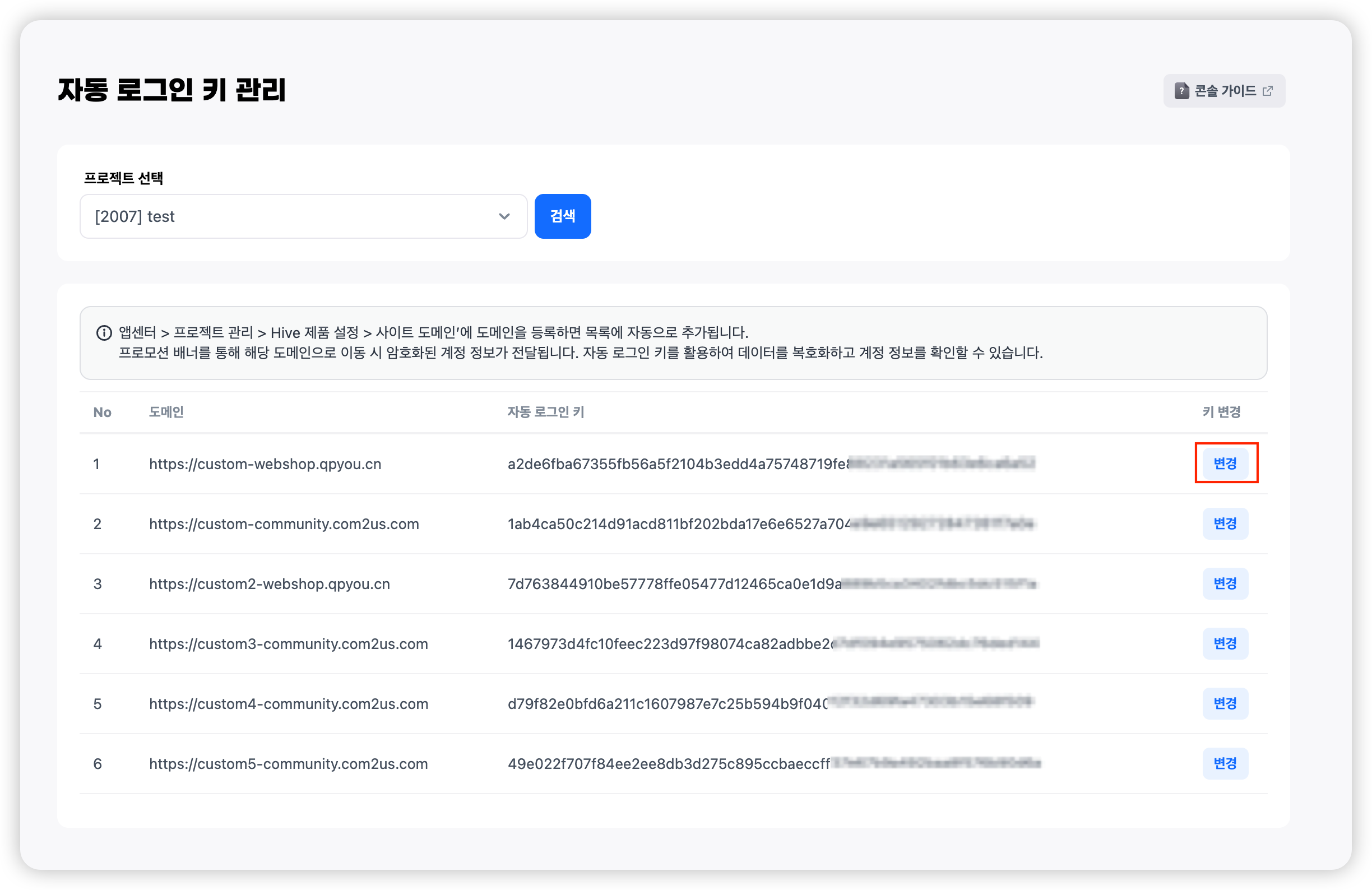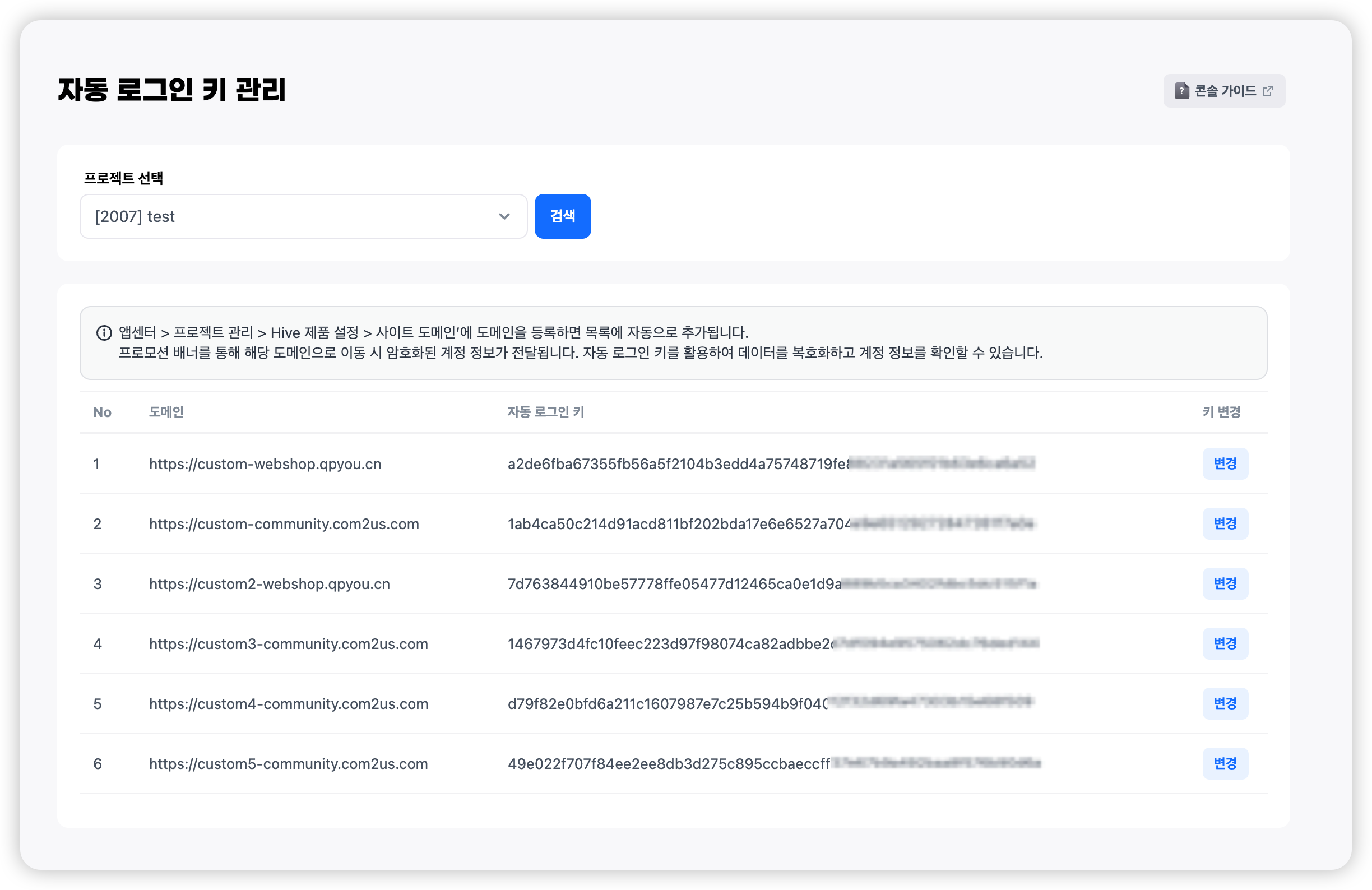 - '콘솔>앱센터>프로젝트 관리>Hive 제품 설정>사이트 도메인'에서 자동 로그인을 지원할 웹사이트의 도메인을 등록합니다.