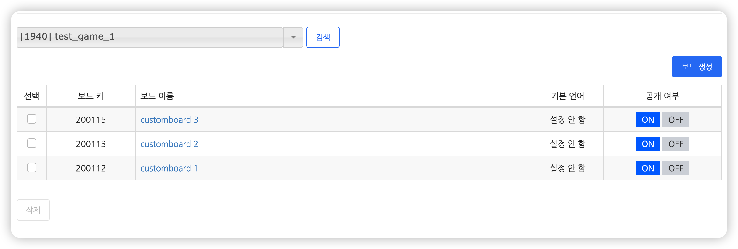 • OFF : 노출할 수 없는 보드입니다. 게임에서 커스텀보드를 호출해도 노출되지 않습니다.