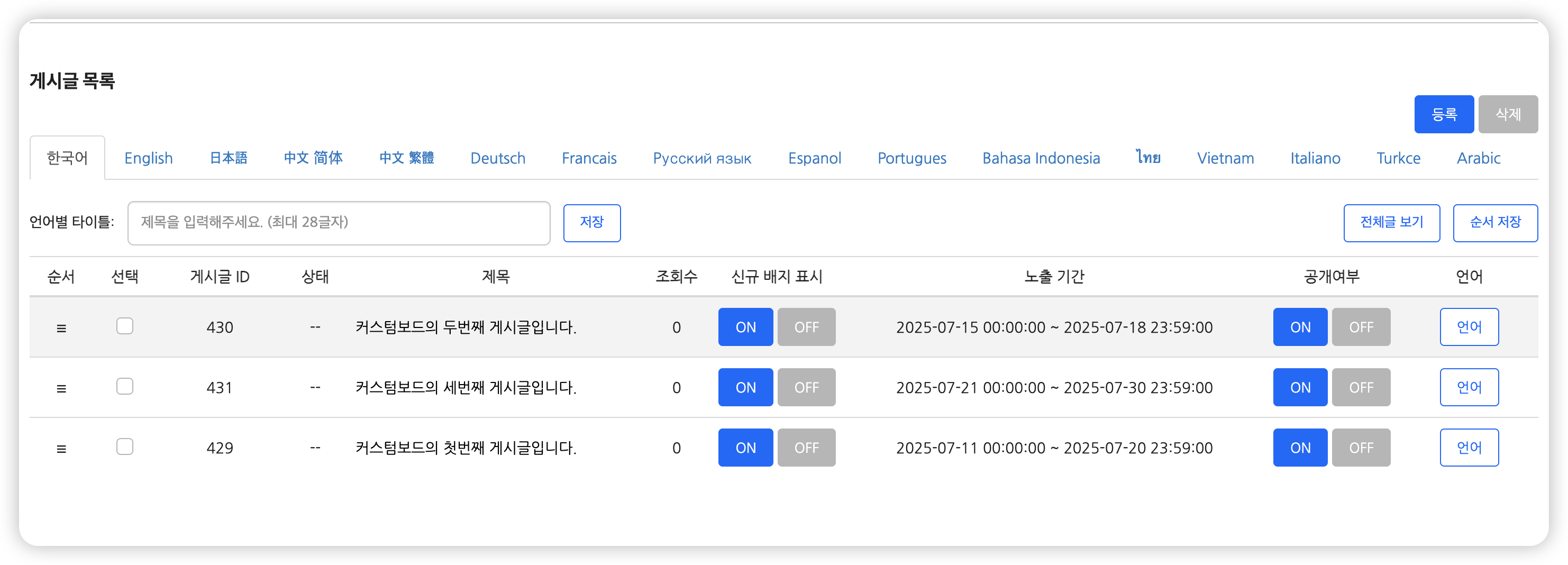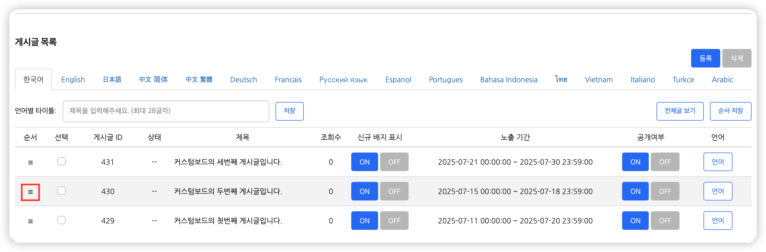 • 전체글 보기 : 다른 언어탭에 등록된 게시글도 보여줍니다. 현재 언어탭에서 등록되지 않은 게시글은 제목에 ‘미등록 게시글’로 표기됩니다. 미등록 게시글을 포함하여 순서를 변경할때 유용합니다.