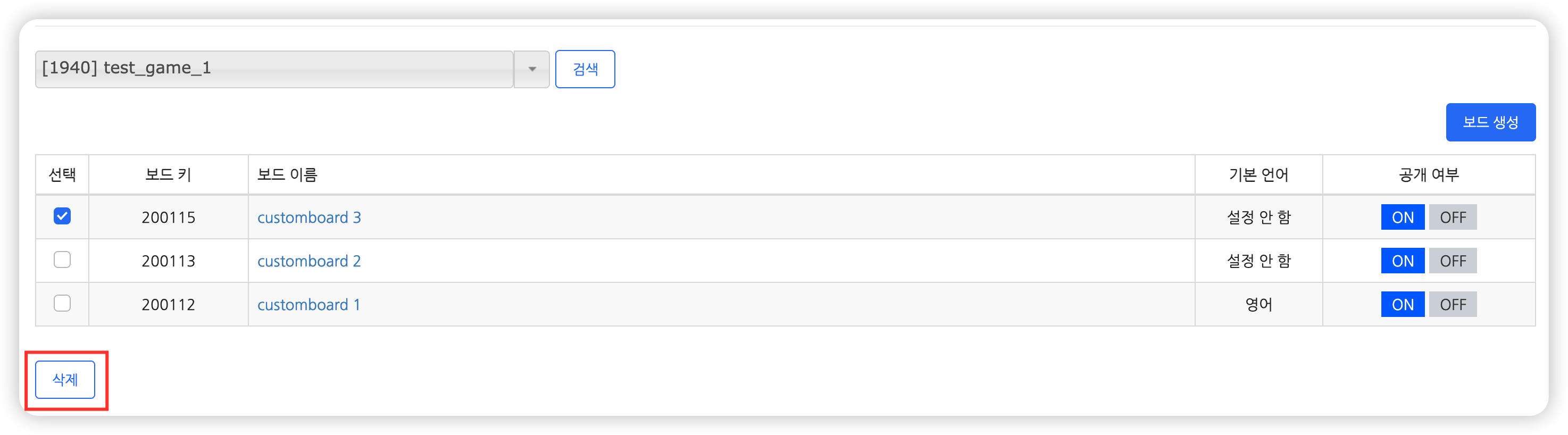 • 삭제할 보드를 선택하고 ‘삭제’ 버튼을 클릭해 주세요.