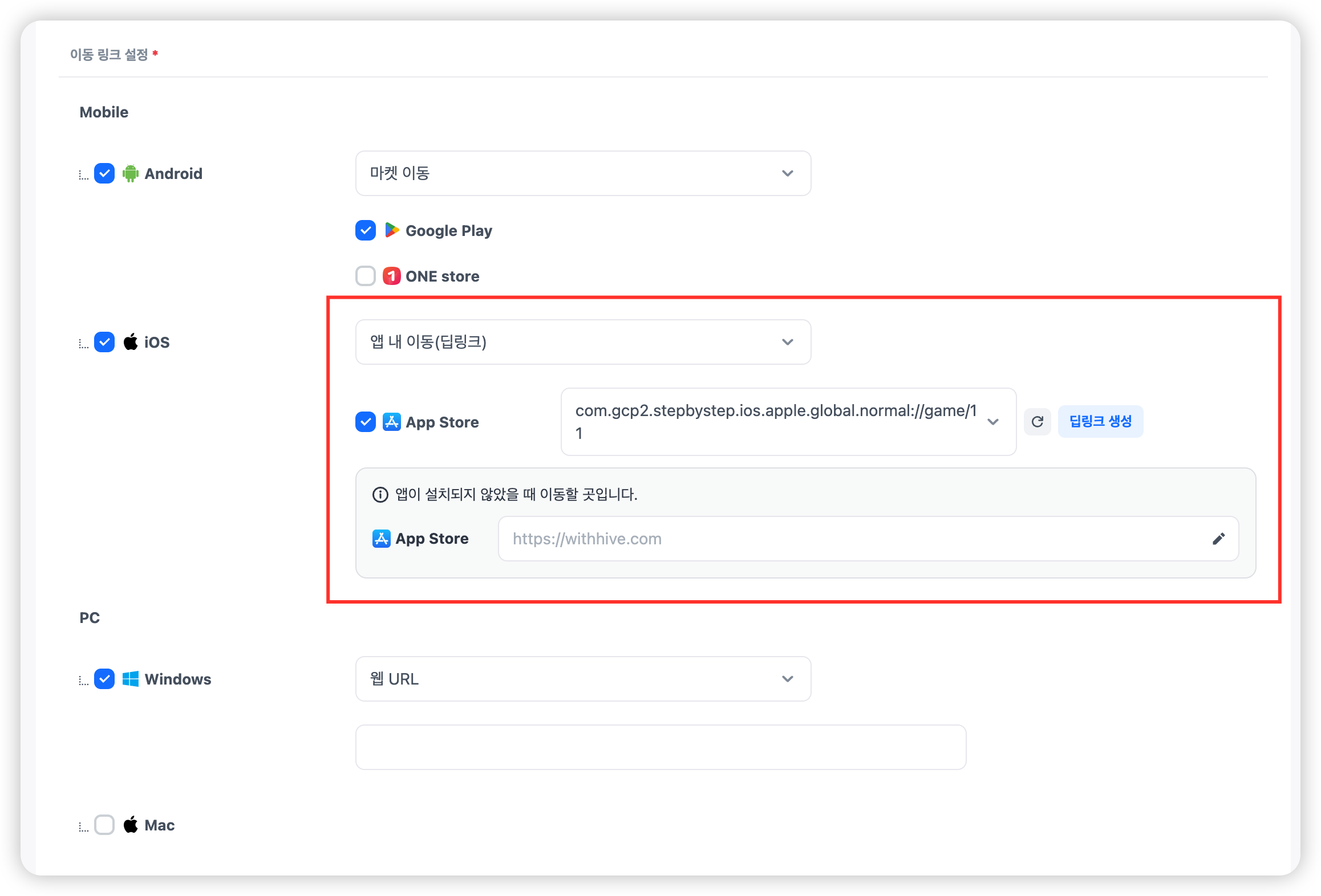 • 미설치자 이동 URL: 앱이 설치되지 않아 앱 실행 및 특정 위치 이동이 불가능한 경우, 대신 이동할 URL을 입력합니다.