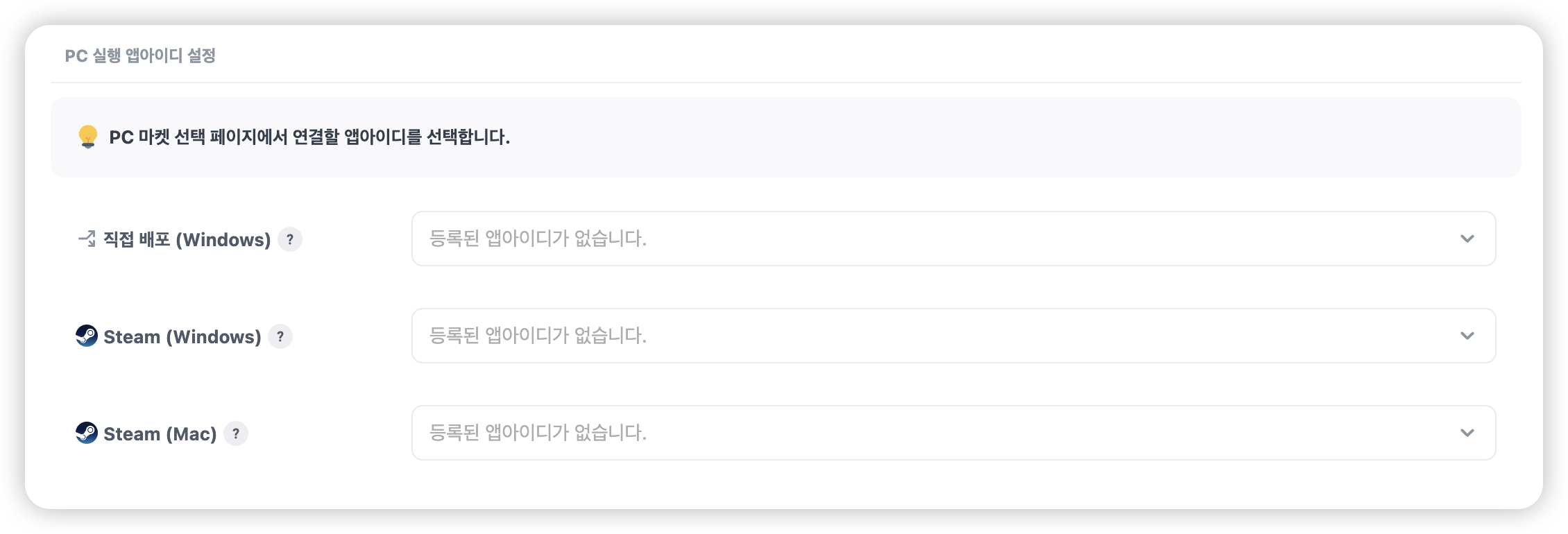 PC '마켓 선택 페이지'에 연결할 앱아이디를 설정합니다.