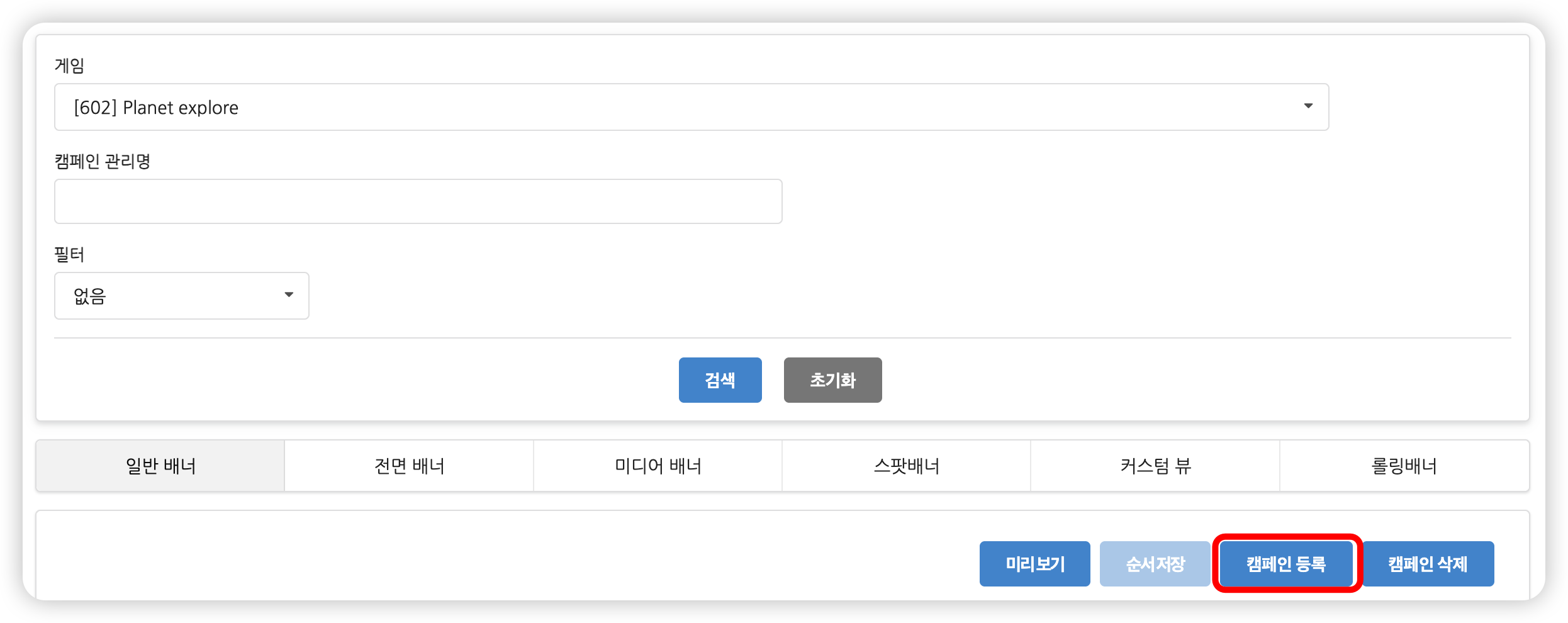 등록하려는 배너 탭으로 이동한 후, 캠페인 등록 버튼을 클릭합니다.