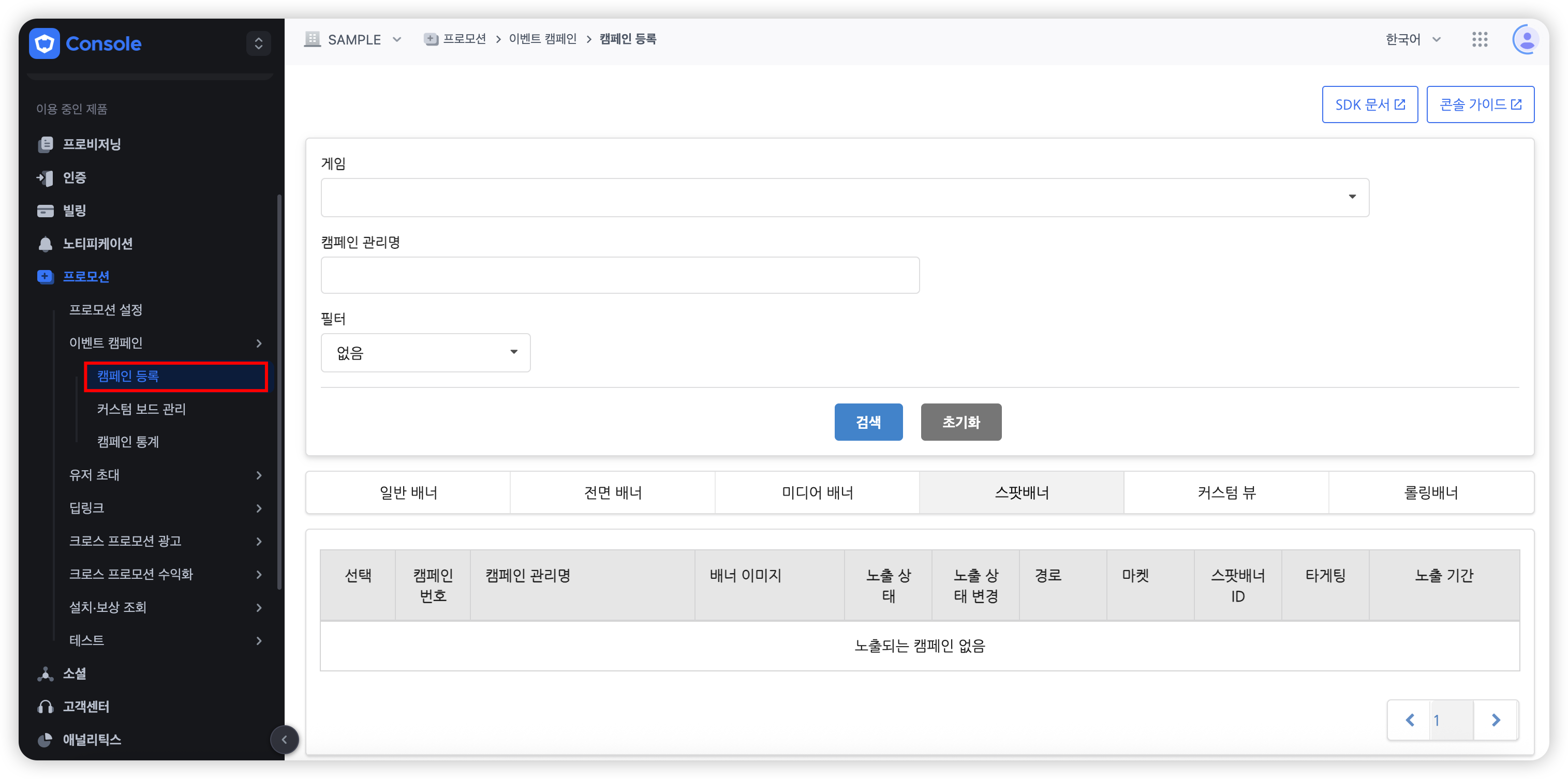 프로모션 -> 이벤트 캠페인 -> 캠페인 등록 -> 게임 선택 -> 스팟 배너 -> 캠페인 등록을 클릭합니다.