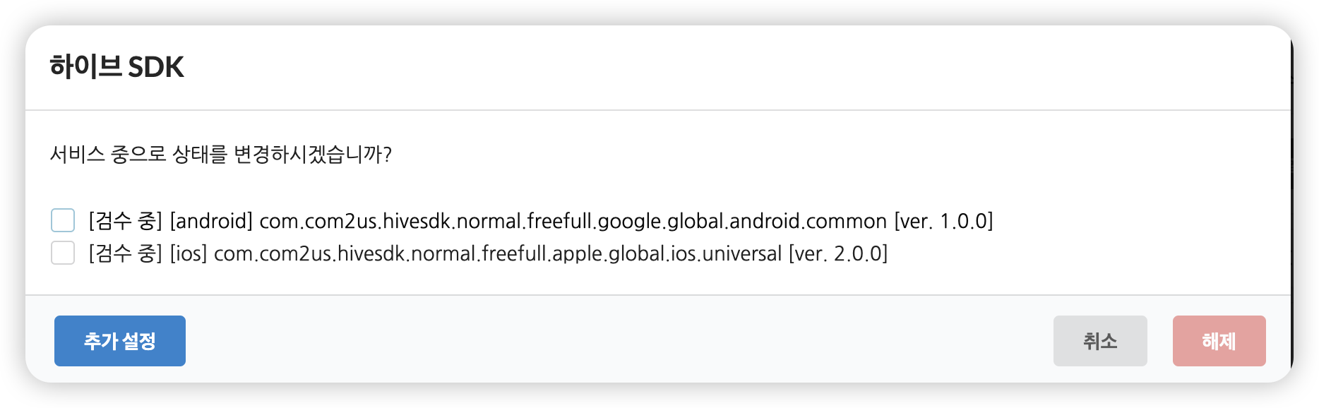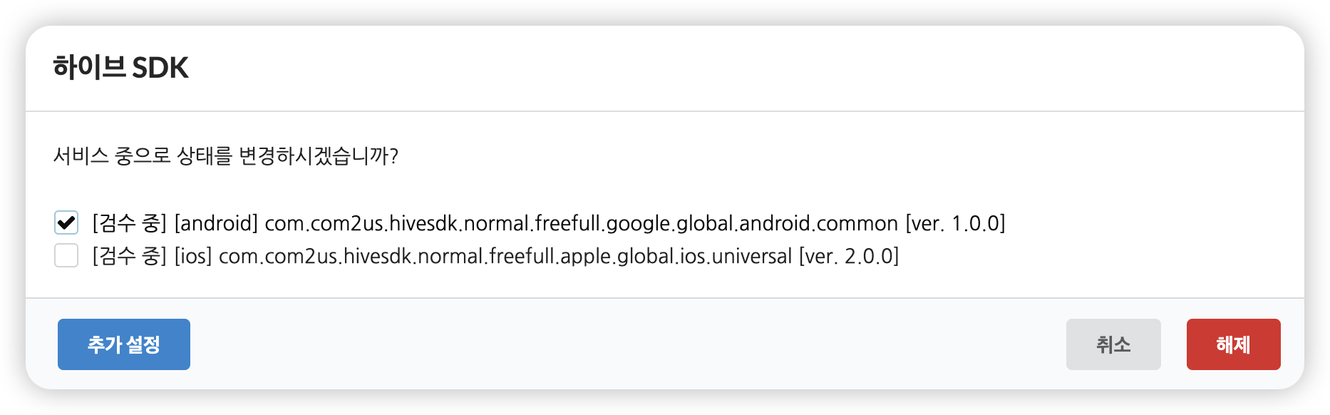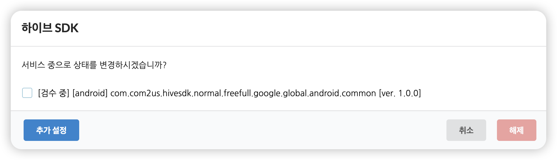 현재 검수중인 AppID와 버전이 항목으로 노출됩니다. 추가 설정버튼을 클릭합니다.