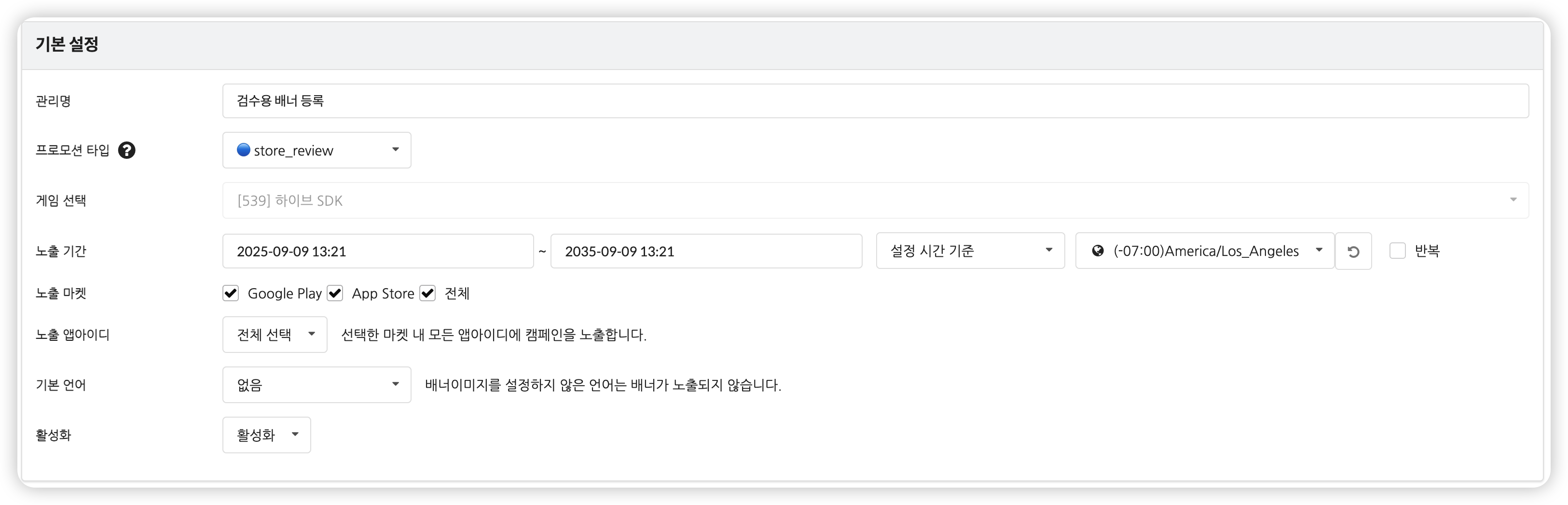 상태는 “활성화” 로 해야 하며, 검수 상태인 AppID외에는 해당 배너가 노출되지 않습니다.
