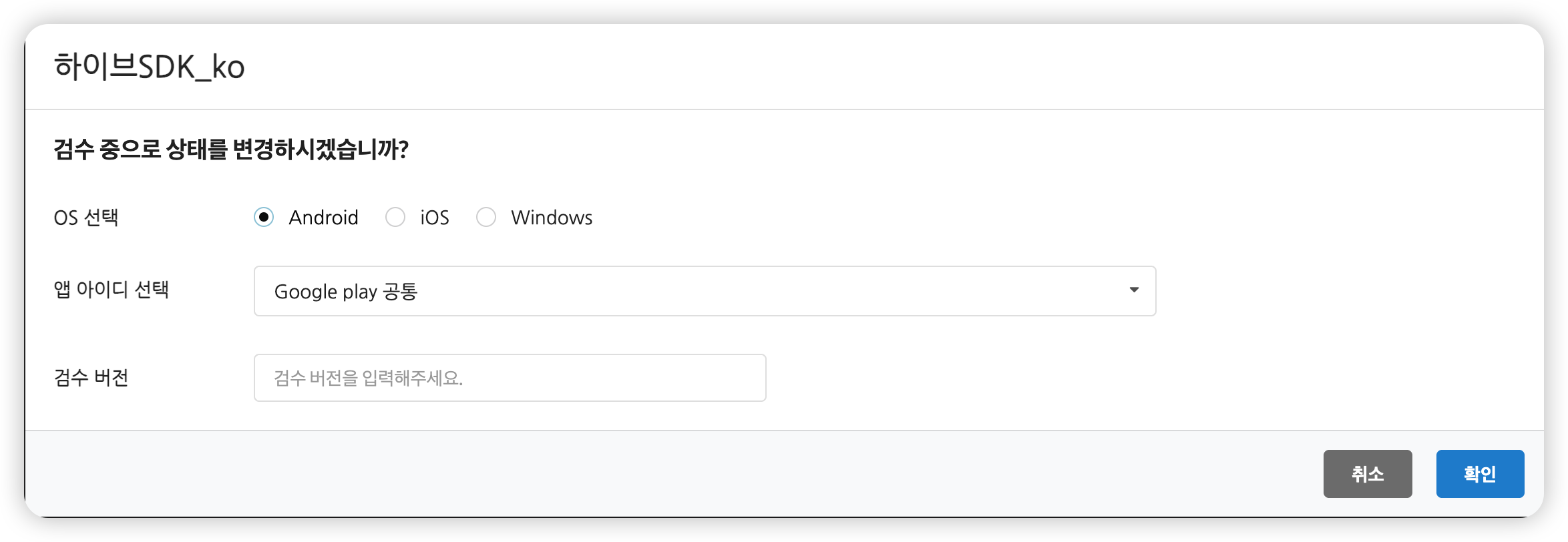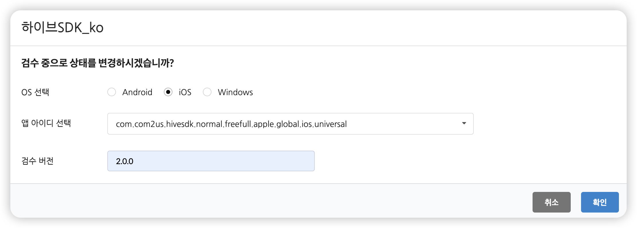 검수 상태로 설정할 OS와 AppID, 앱버전을 선택한 후 '확인'을 클릭해 주세요.