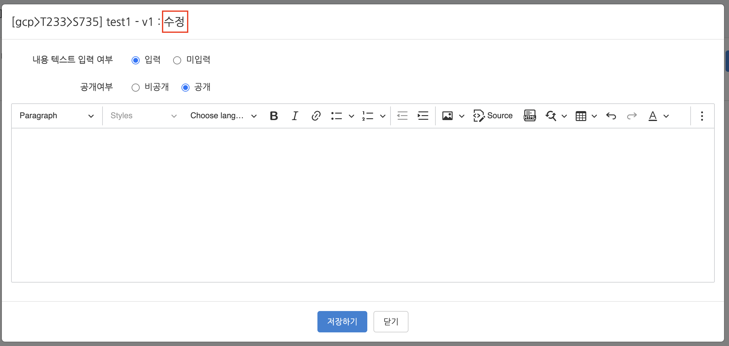 • 새 버전의 약관은 팝업창에서 작성할 수 있습니다. ‘내용 텍스트 입력 여부’를 ‘미입력’으로 선택하면 하단 텍스트 에디터가 보이지 않으며, 이는 내용이 없는 약관을 등록할 때 사용하는 기능입니다. 기본 설정은 ‘입력’입니다.