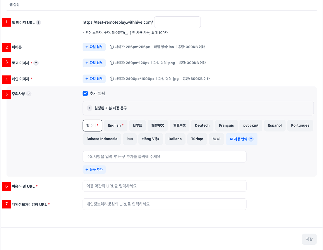 - 리모트 플레이 웹 페이지 푸터에 노출할 이용 약관 링크를 추가하세요. URL은 하나만 등록할 수 있으므로, 등록하는 웹 페이지 자체에서 다국어를 지원해야 합니다.