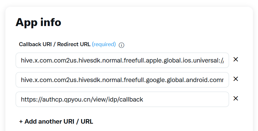 Callback URI는 아래와 같이 X Developer Portal에서 생성한 프로젝트의 User authentication settings > App info 에 설정합니다.