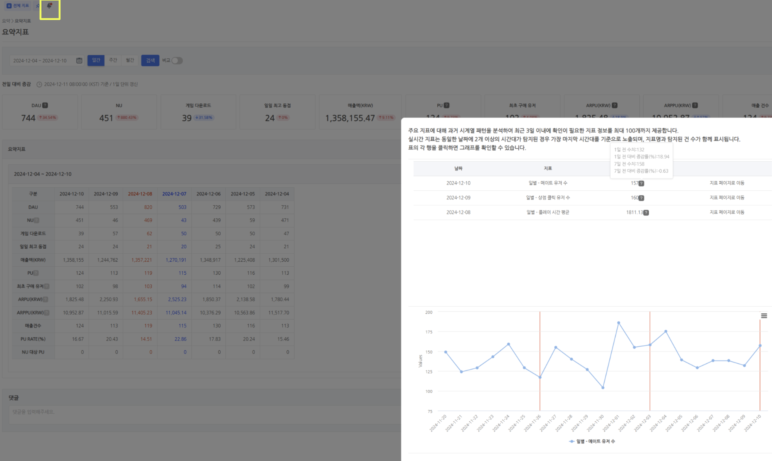 • DAU, NU, 게임 다운로드, 일일 최고 동접, 매출액, PU, 최초 구매 유저, ARPU, ARPPU, 매출 건수에 대한 지표를 제공합니다.