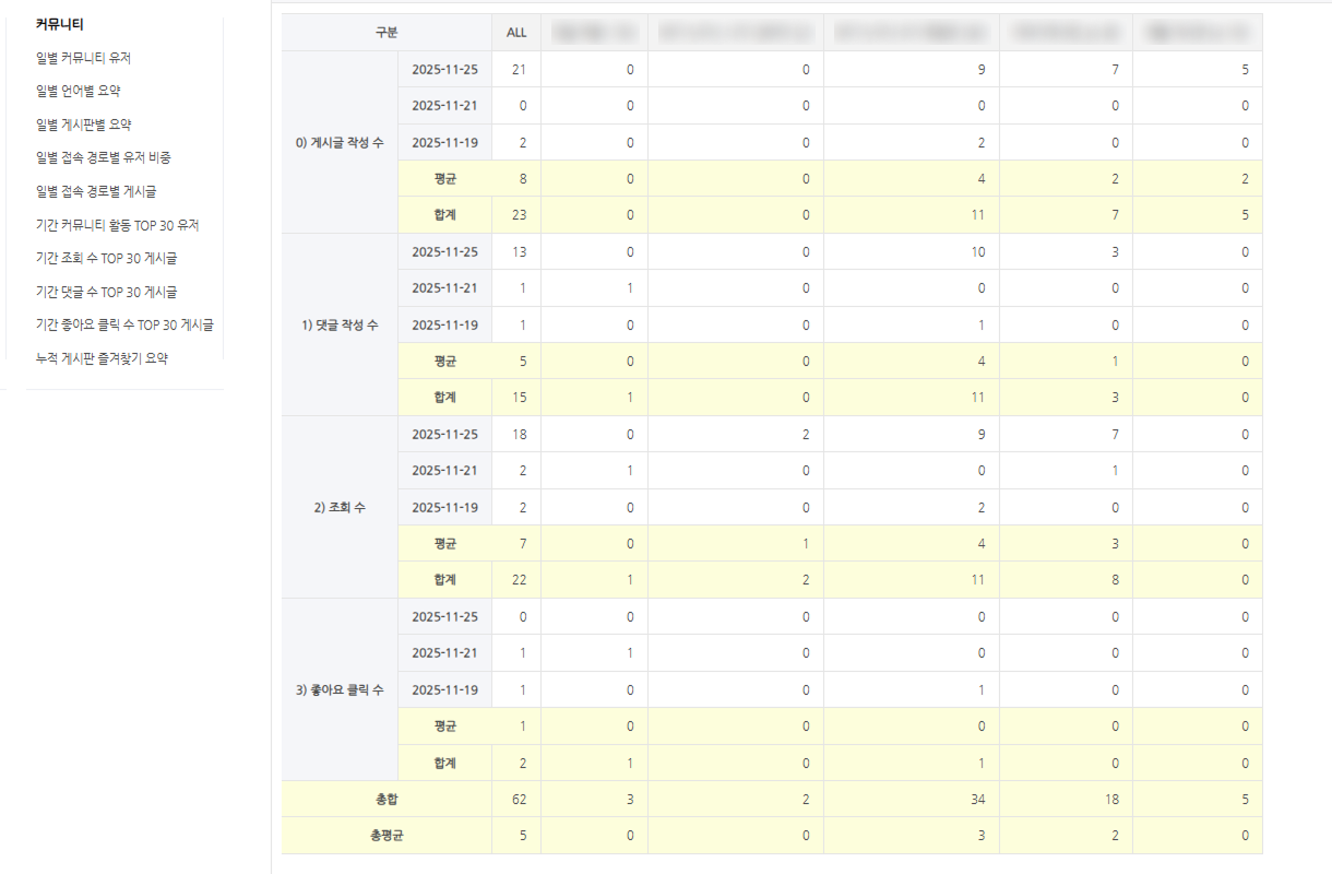 - 2025년 11월 이전 데이터: 애널리틱스에서 조회가 불가능한 과거 데이터는 기존 '커뮤니티 통계' 메뉴를 이용해 주세요.