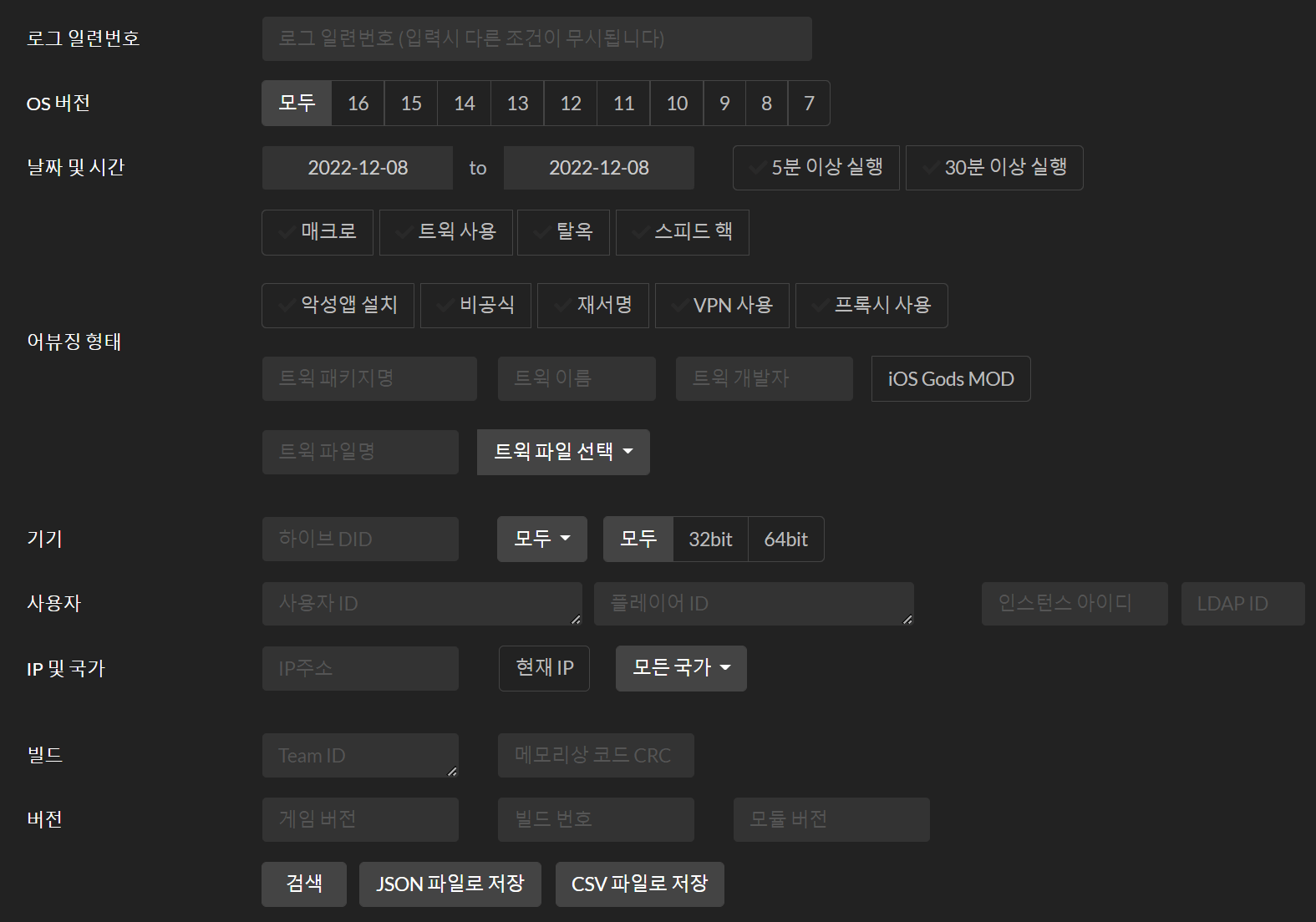 Hive 콘솔 → 게임보안 → 어뷰징탐지 메뉴에서 각종 탐지 통계를 보거나 로그를 검색할 수 있습니다.