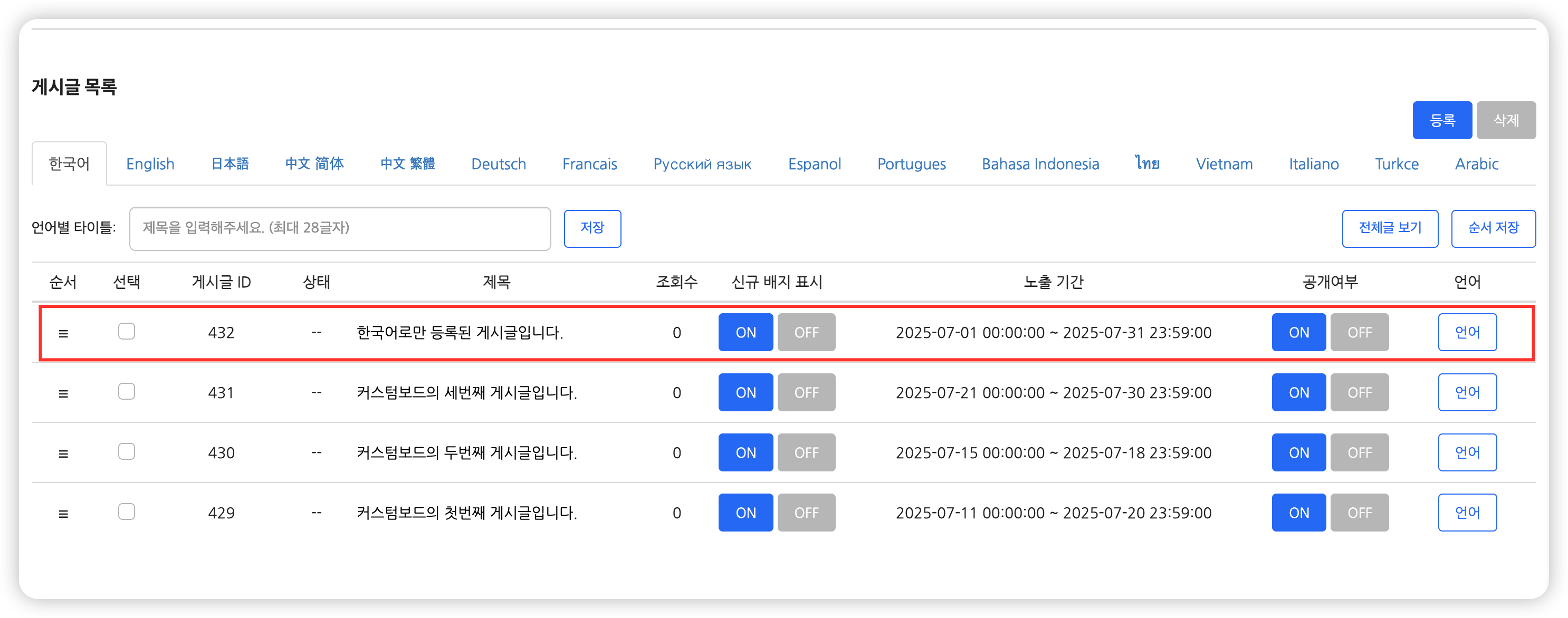 - 게시글 ID : 모든 언어탭에 공통으로 적용되는 ID값입니다. 각 언어탭에서는 ID값을 통해 동일한 게시글임을 확인할 수 있습니다.