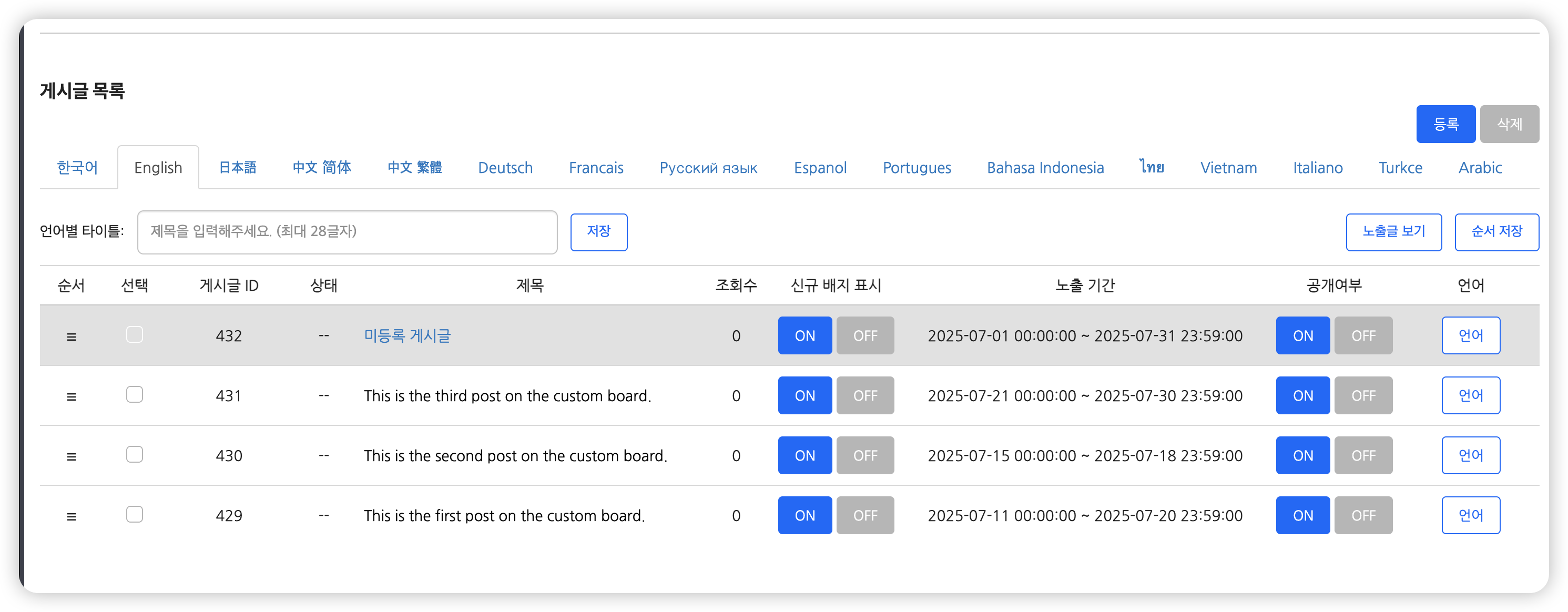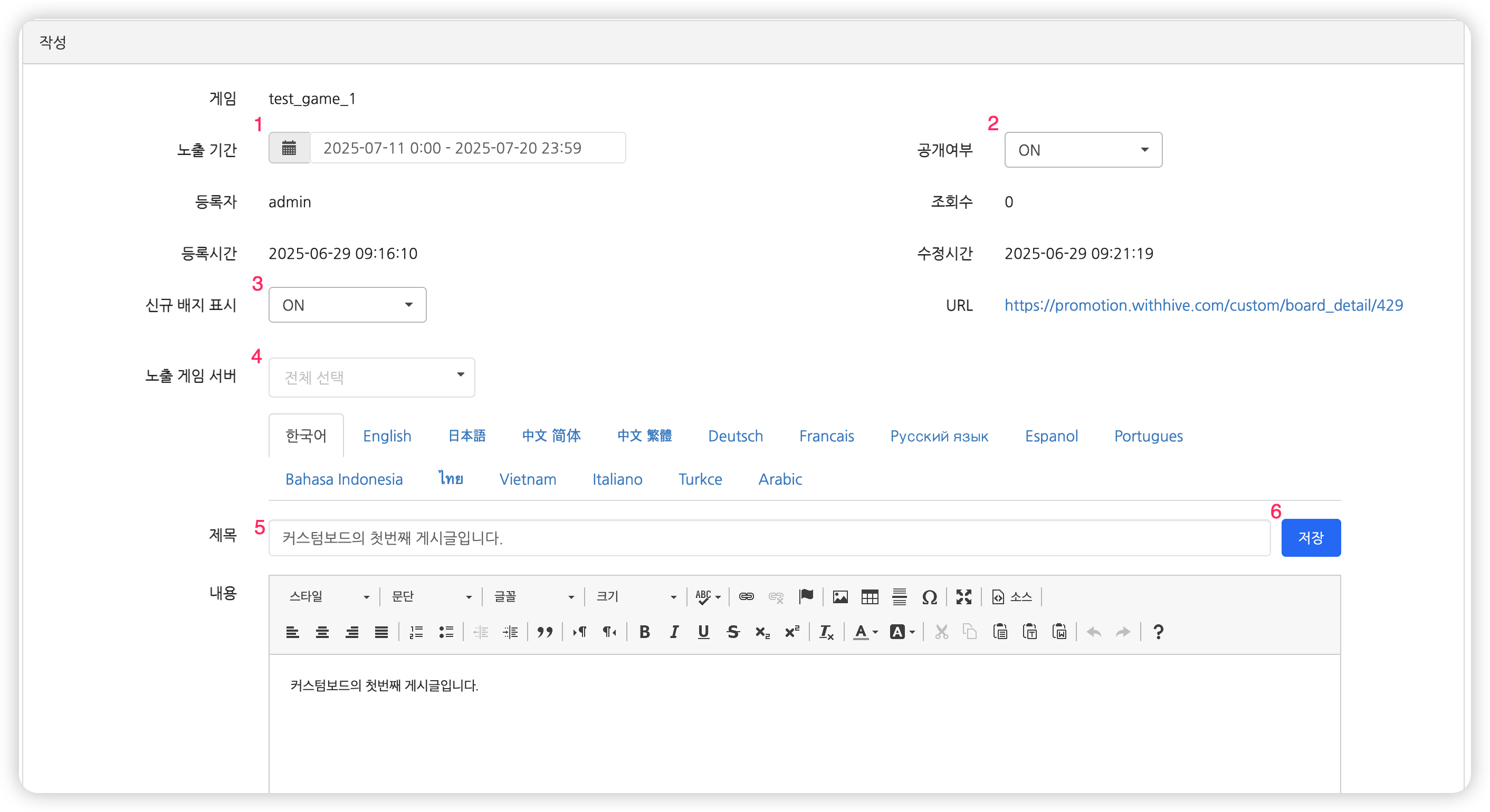 - 커스텀 보드 게시글은 내용을 입력한 언어값에서만 노출됩니다. 만약 모든 언어에서 게시글을 노출하고 싶으시다면 기본 언어 기능을 사용할 수 있습니다.
