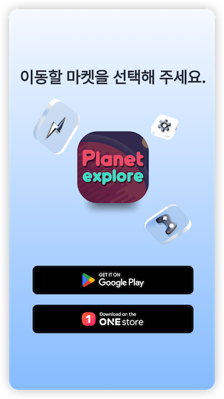 - 주요 안드로이드 마켓 지원: 안드로이드의 경우 구글 플레이 스토어와 원스토어로 유저를 안내할 수 있습니다. 두 마켓을 모두 설정 시, 유저에게 마켓 선택 페이지를 제공합니다.