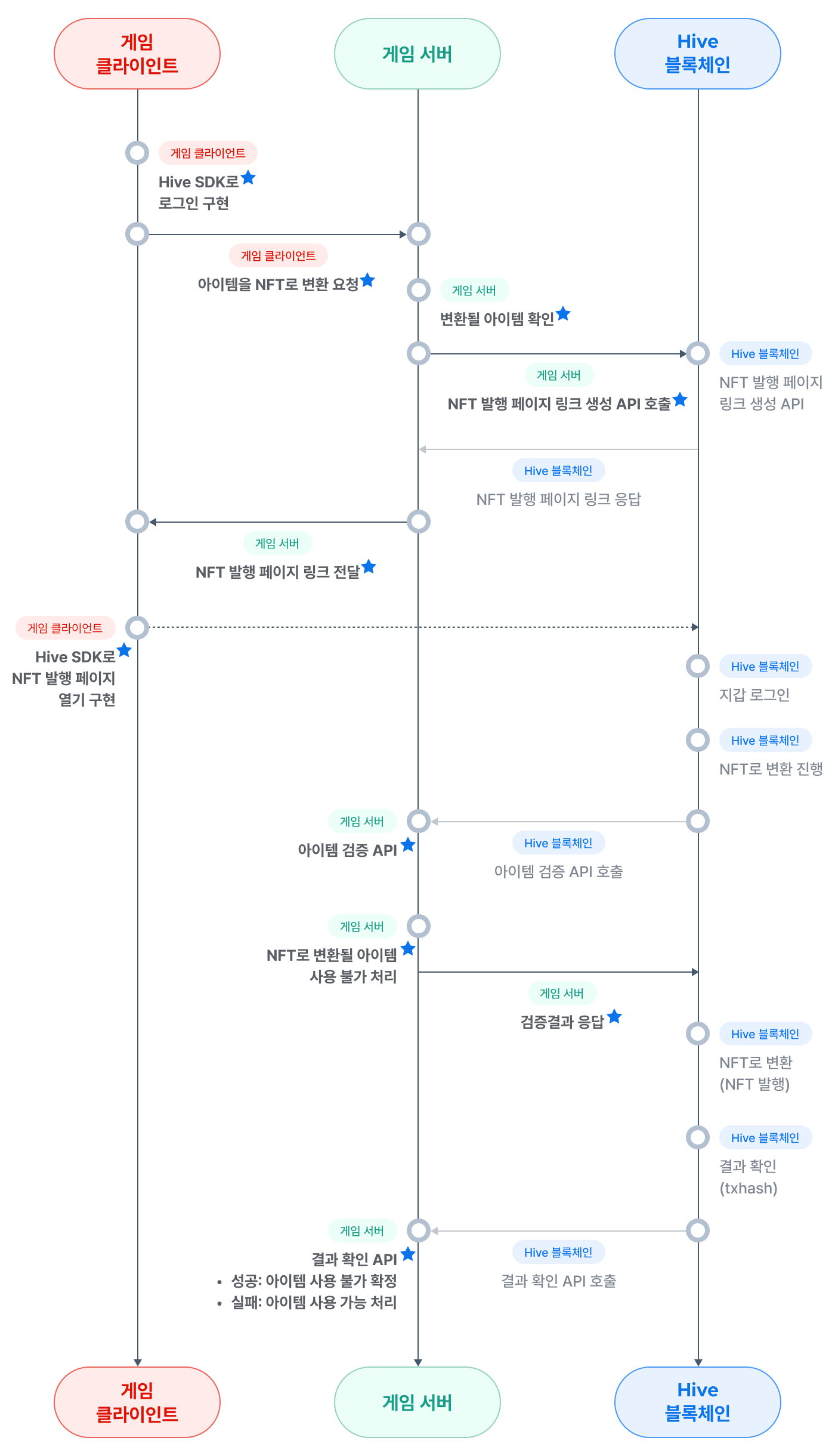 아래는 Mint 기능 구현 과정입니다. Mint 기능을 구현하려면 아래 흐름도 이미지와 가이드 내용을 따라 따라 게임 클라이언트(Hive SDK, 게임 클라이언트)와 게임 서버 영역에서 코드를 구현하세요. 아래 그림에서 파란색 별표가 붙어있는 부분이 개발사에서 작업해야 할 부분입니다. 주요 작업에 관한 자세한 내용은 아래 가이드를 참고하세요.