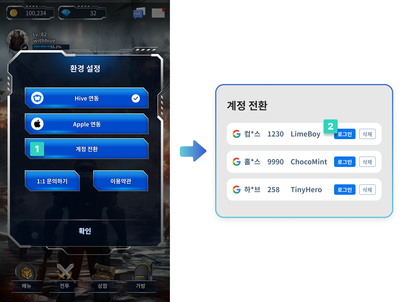 로그아웃 상태에서 여러 계정 간 전환 기능을 통해 저장된 계정(PlayerID)로 빠르게 로그인합니다.