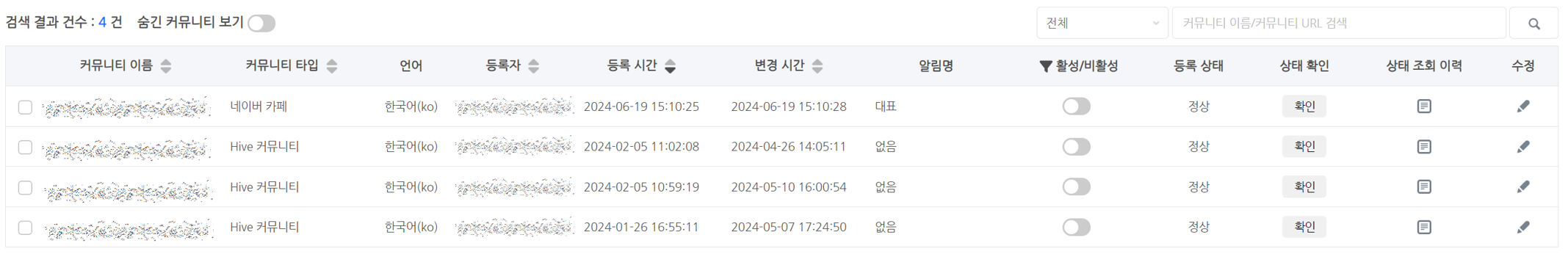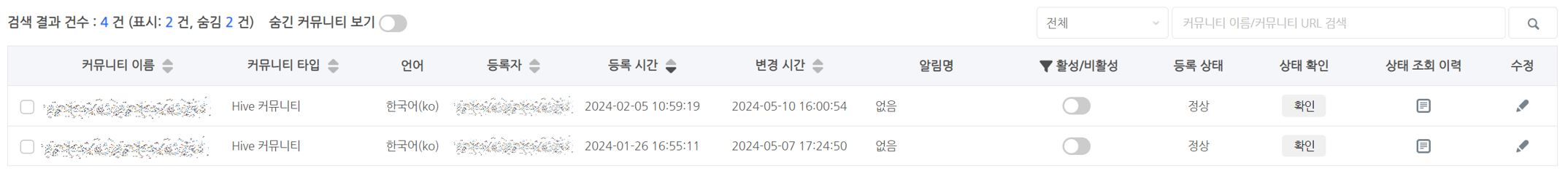 - Hive 커뮤니티 사용 시, 등록된 커뮤니티 목록에서 이미 등록된 커뮤니티 정보를 확인할 수 있습니다.