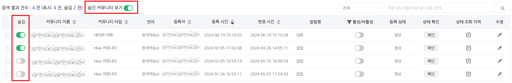 - 숨겨진 커뮤니티가 있을 경우, 표시 건수와 숨김 건수를 각각 확인할 수 있습니다.