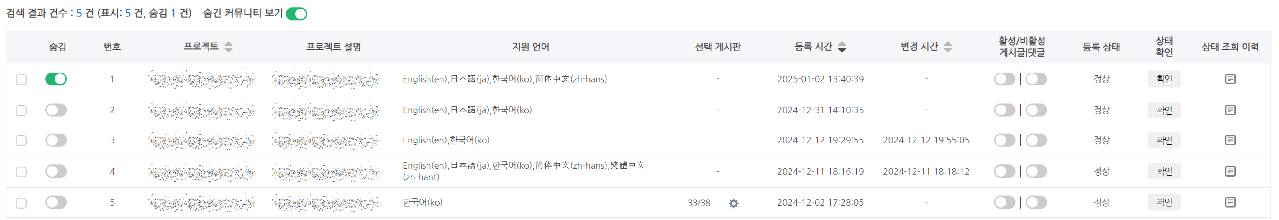 - 숨김 설정 후 "숨김 커뮤니티 보기"를 비활성화하면 숨긴 커뮤니티를 제외한 나머지 커뮤니티 목록이 노출됩니다.