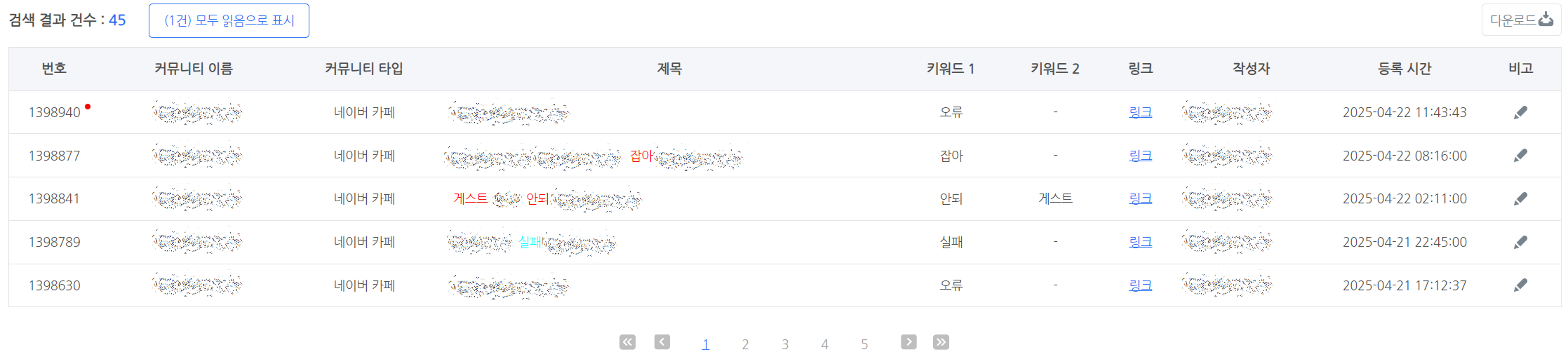 - 키워드: 키워드 모니터링 시스템에서 등록한 키워드 목록이 노출되며 특정 키워드들이 포함되어 있는 게시글을 검색할 수 있습니다.