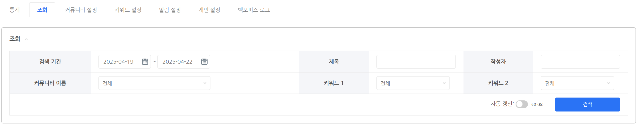 - 커뮤니티 이름: 키워드 모니터링 시스템에 등록한 커뮤니티 이름으로 게시글을 조회할 수 있습니다. 개인 설정에서 검색 커뮤니티를 설정한 경우 적용됩니다.