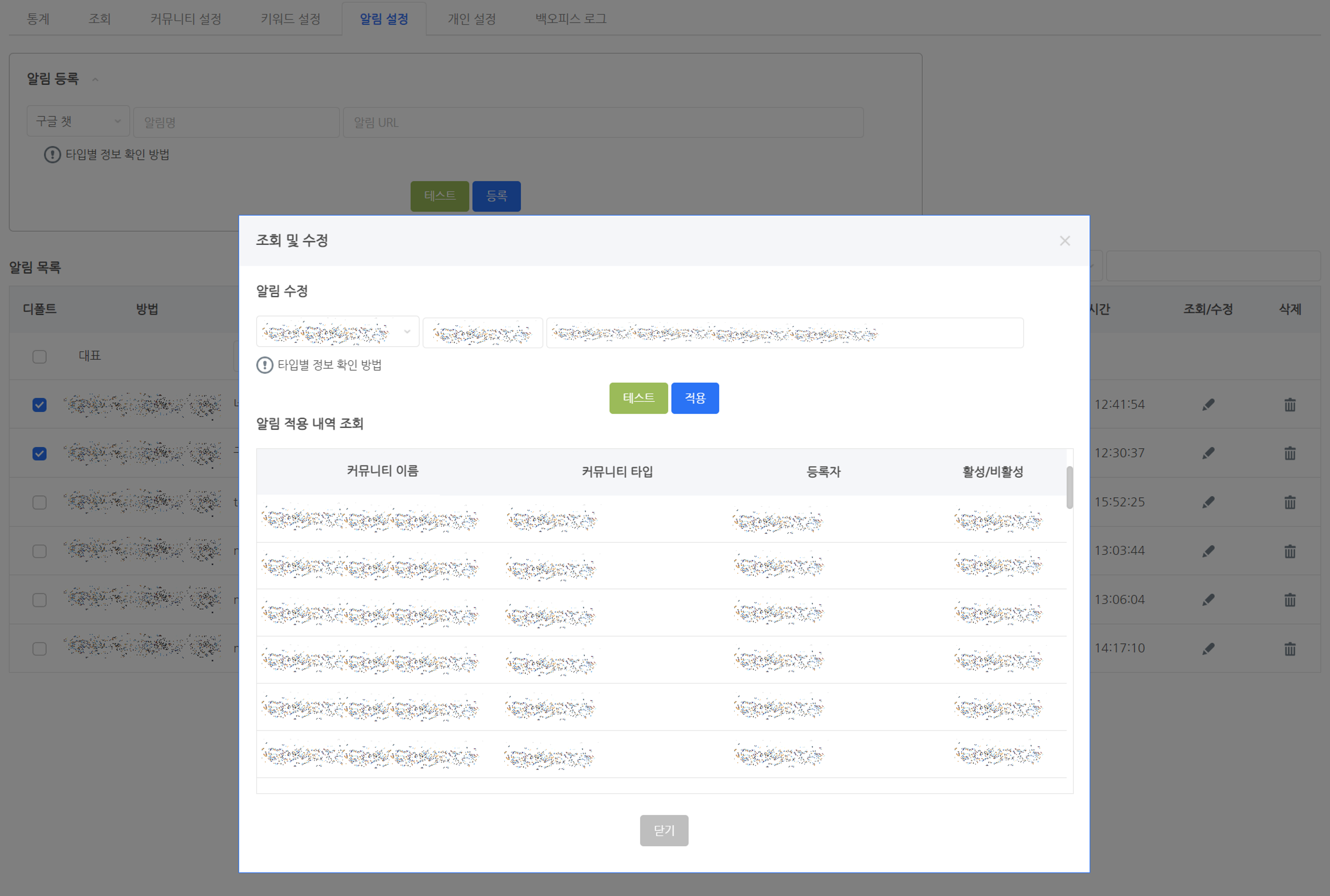 - 수정: 아이콘을 클릭하면, 아래와 같은 수정 팝업에서 커뮤니티 정보를 수정할 수 있습니다.