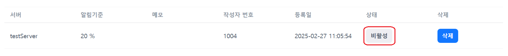 - 설정 추가 후에는 리스트에서 비활성 버튼을 클릭하여 활성화 상태로 변경 해야 동접 모니터링이 시작 됩니다.